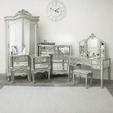Silver Mirrored Double Wardrobe, Chest of Drawers, Large Dressing Table Set & Bedside Tables - Tiffany Range