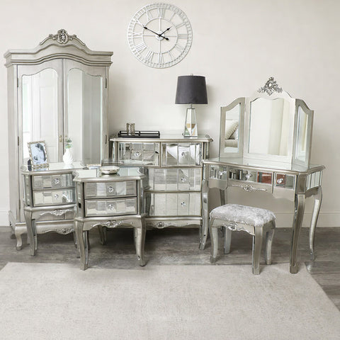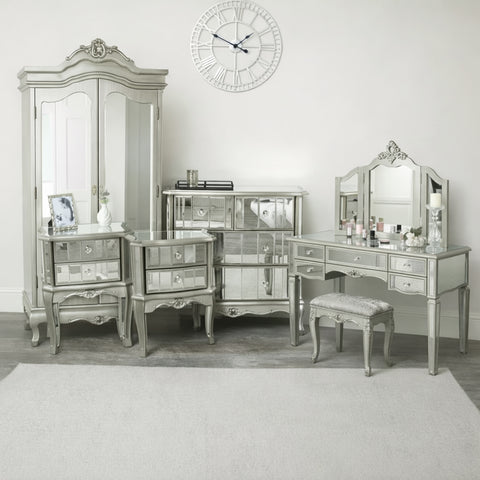 Silver Mirrored Double Wardrobe, Chest of Drawers, Dressing Table Set & Bedside Tables - Tiffany Range