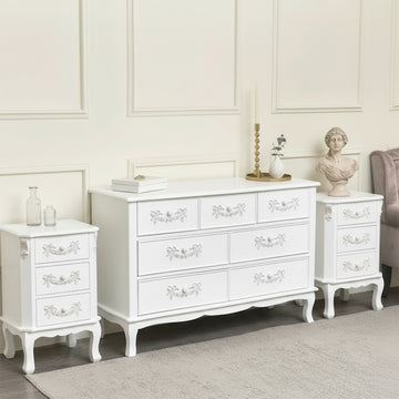 Antique White 7 Drawer Chest of Drawer & Pair of 3 Drawer Bedside Tables - Pays Blanc Range