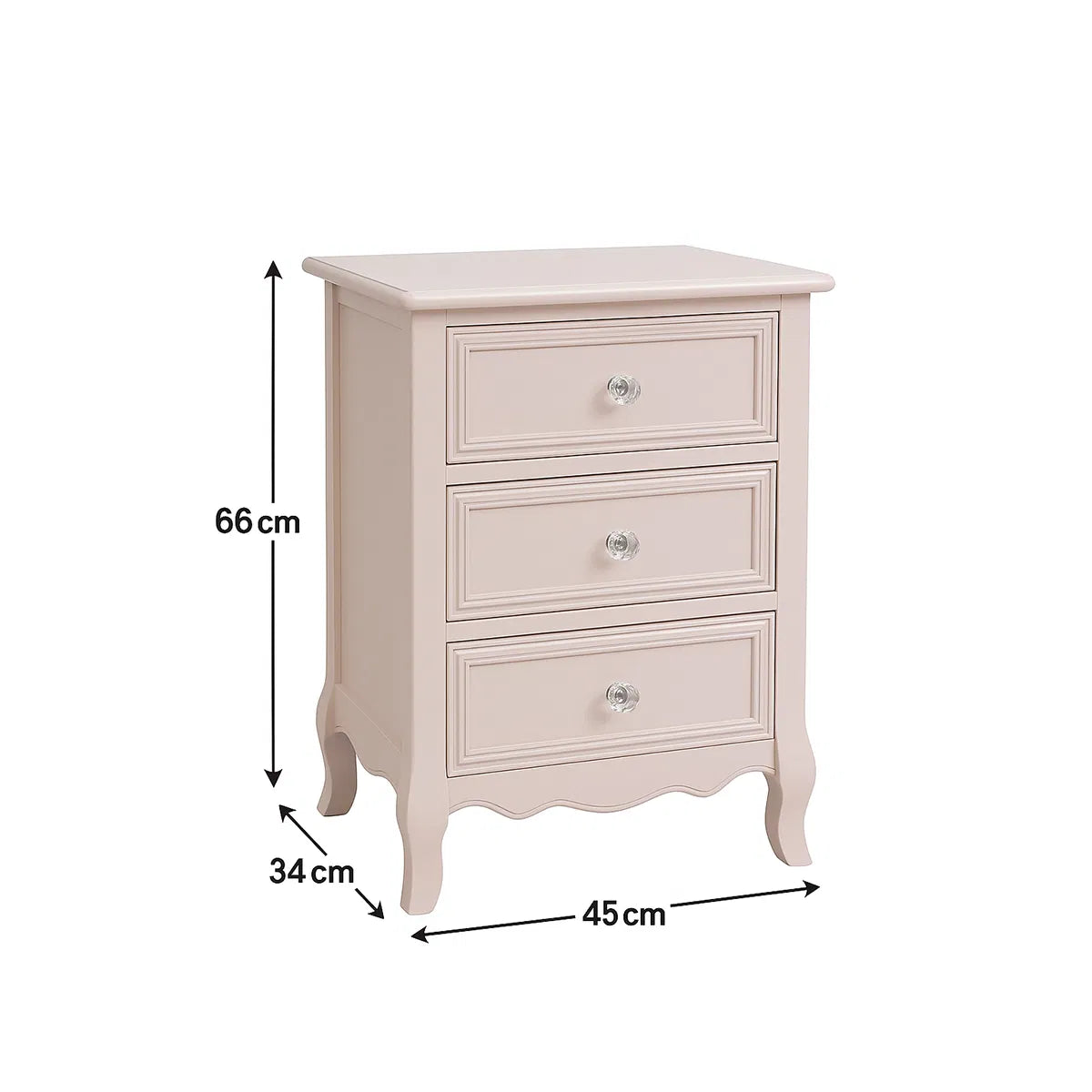 This 3 Drawer Bedside Table is a beautiful, vintage inspired storage piece, perfect for placing in a bedroom or living room. Made of wood, this side table has a 3 drawer design and comes with an elegant, french inspired design. It is completed with a pale pink painted finish and rounded crystal style handles.
