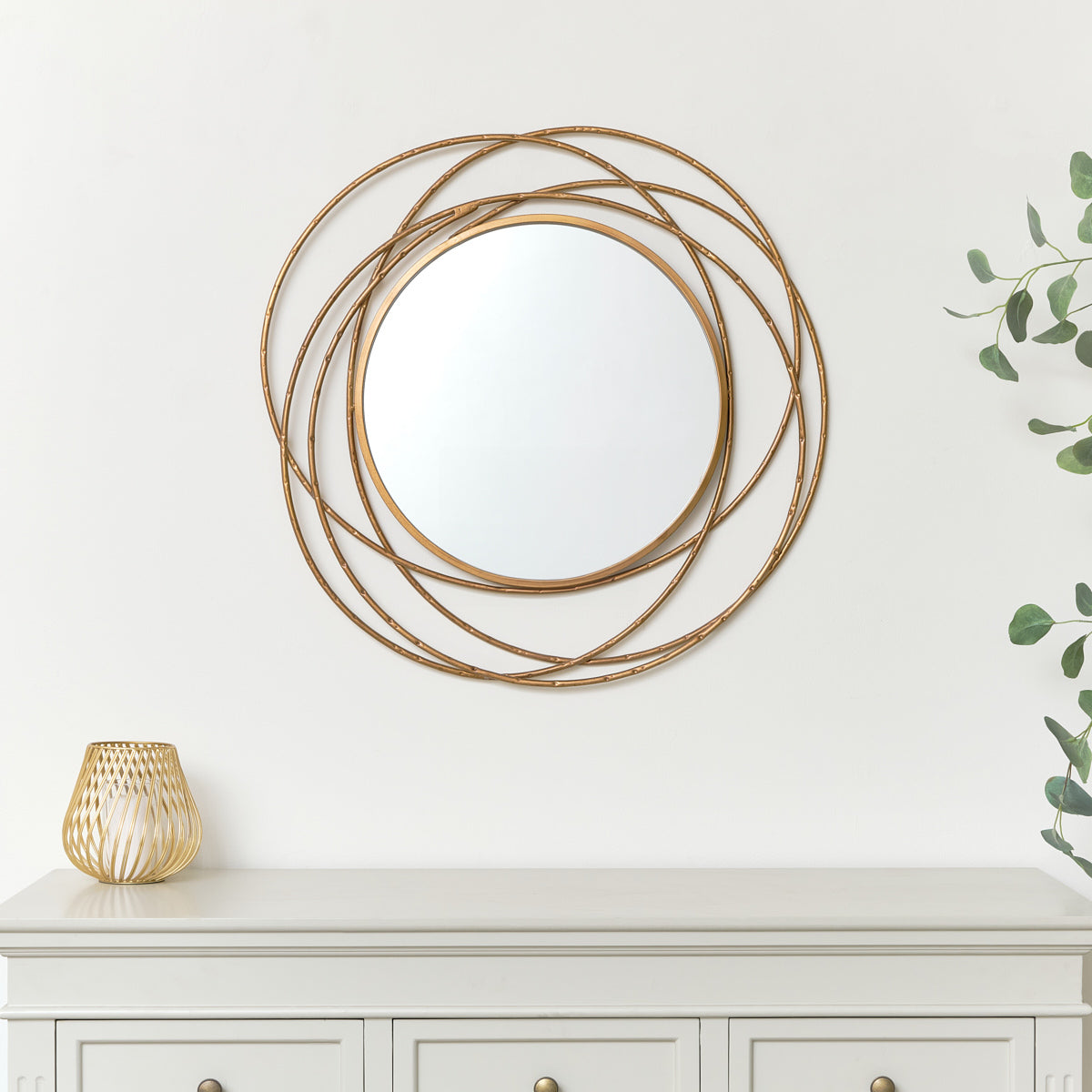 Due to it's gold finish and swirl design, this mirror is best suited for modern, minimalist, retro or vintage style spaces.