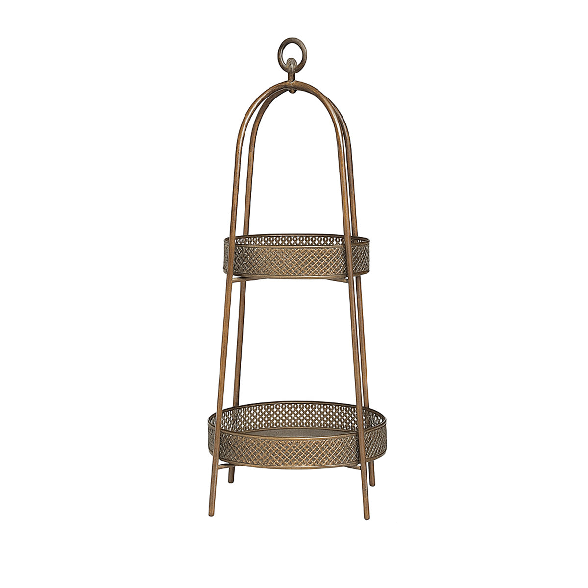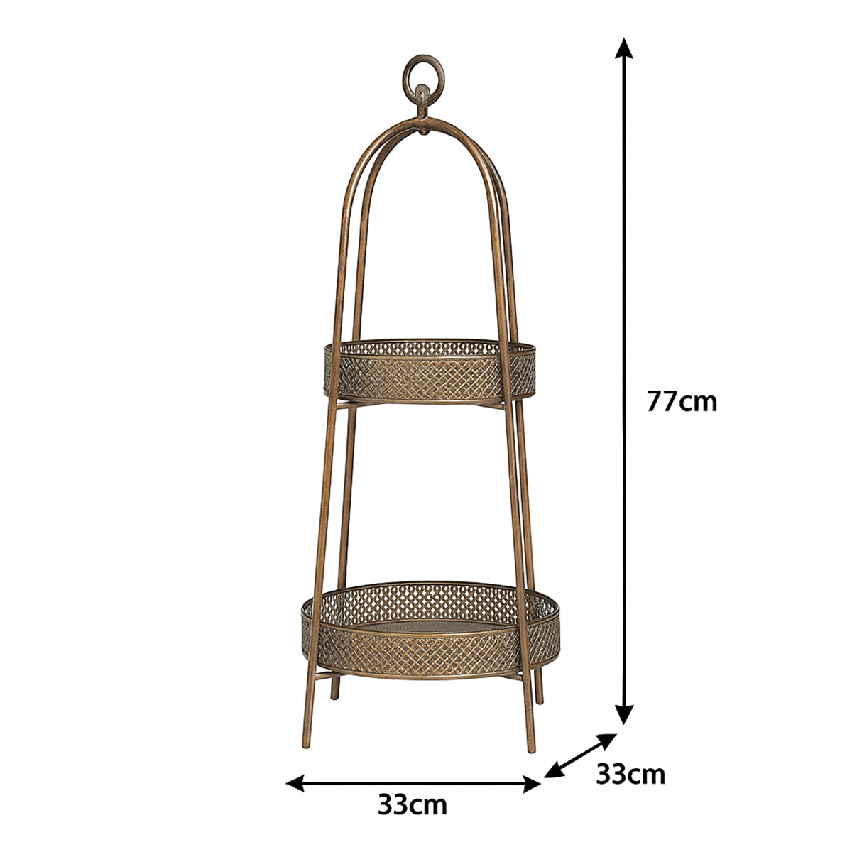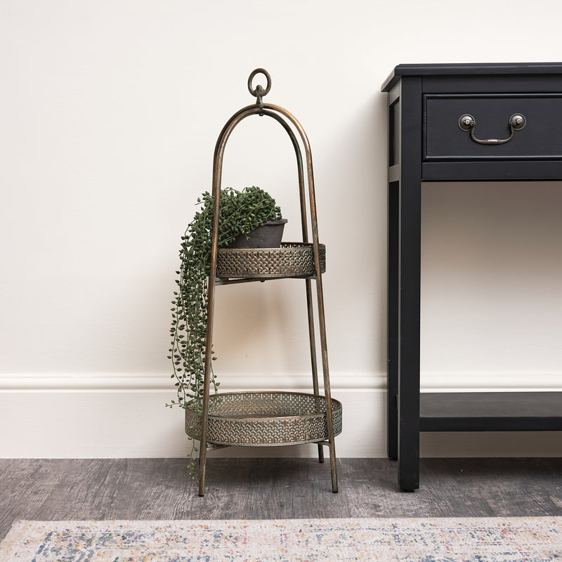 This Antique Gold Two Tier Freestanding Shelf is a beautiful, vintage style storage shelving unit, ideal for fans of ornate detailing and old decor. Made of metal, this storage piece comes with an arched design and two round, removable trays for shelves.