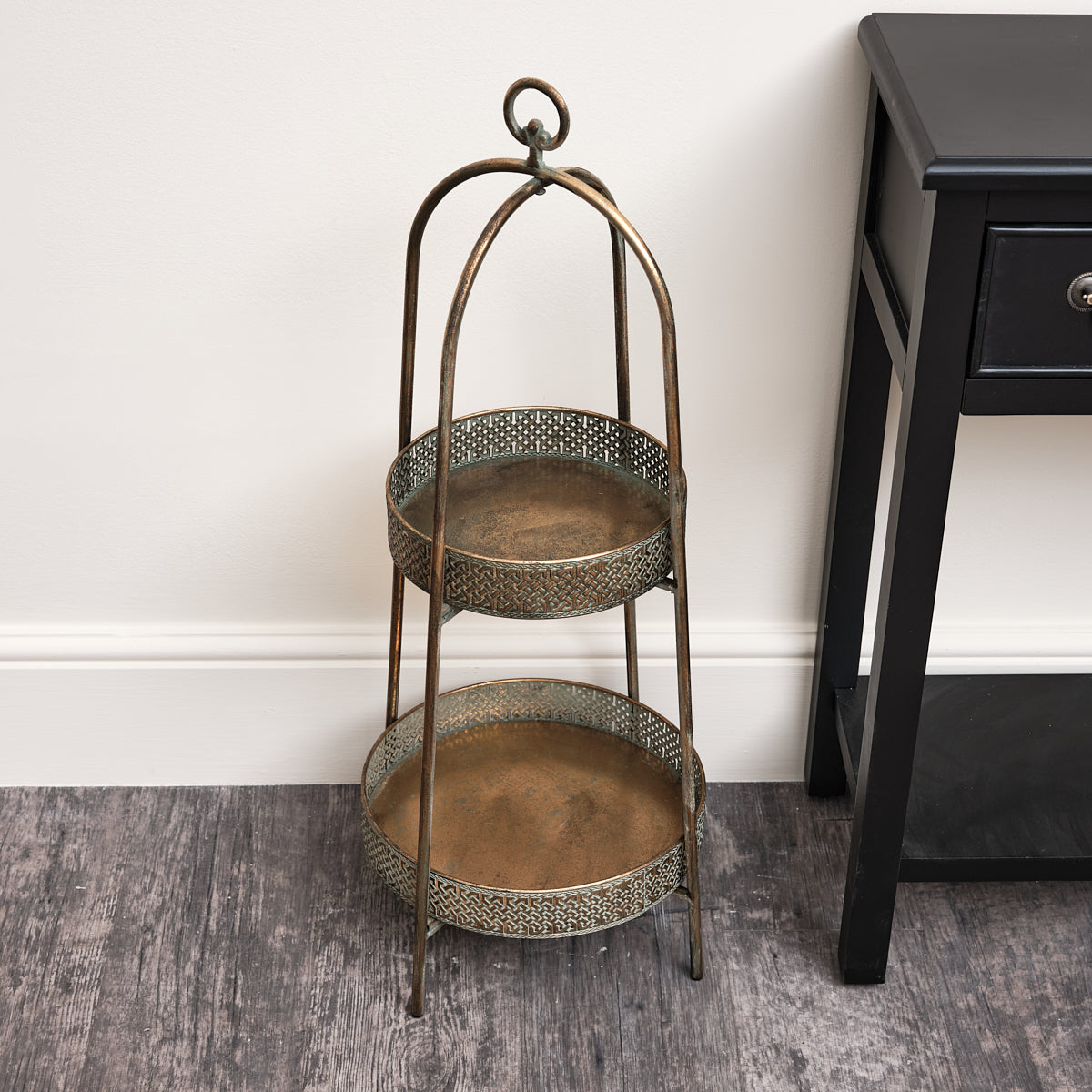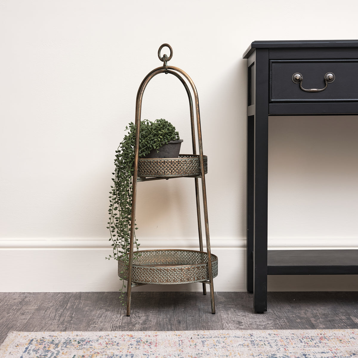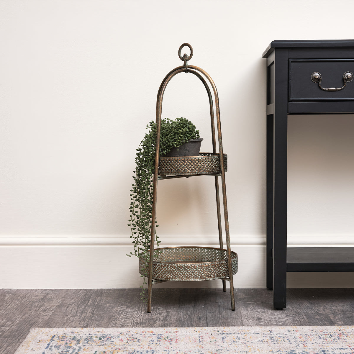 I really like this! I’d built up a lot of small plant pots and I wanted a central place to have them so things didn’t look so cluttered and messy everywhere. This looks great. I’ve got three smaller plants near the edges of the bottom and then one larger one on the top and it looks really good. It’s very easy to put together and you can easily move it around with the loop at the top should you need to. A nice antique colour that’s helped bring my whole room together. Really pleased, very stylish.