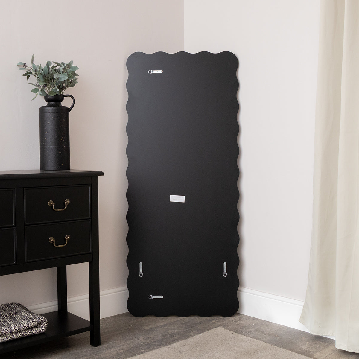 This Black Full Length Wavy Mirror 70cm x 165cm is an eye catching, retro inspired large mirror that could be wall mounted or used as a leaner mirror. Made of wood, glass and metal, this mirror has a slim, wavy wooden frame and comes with a Black painted finish. It can be wall hung both vertically and horizontally via wall hooks on the back of the mirror.