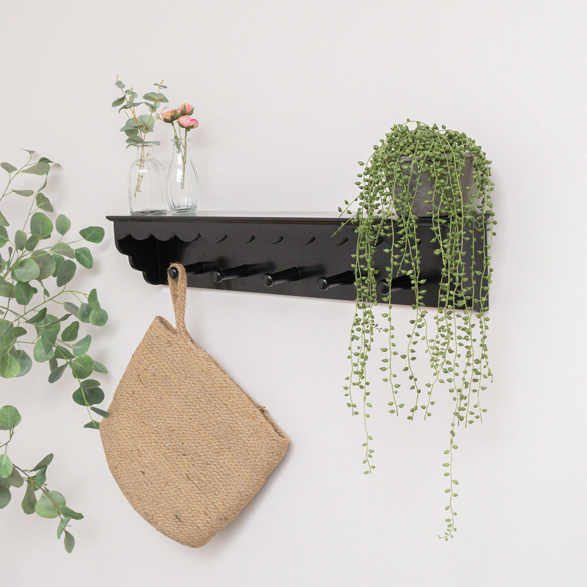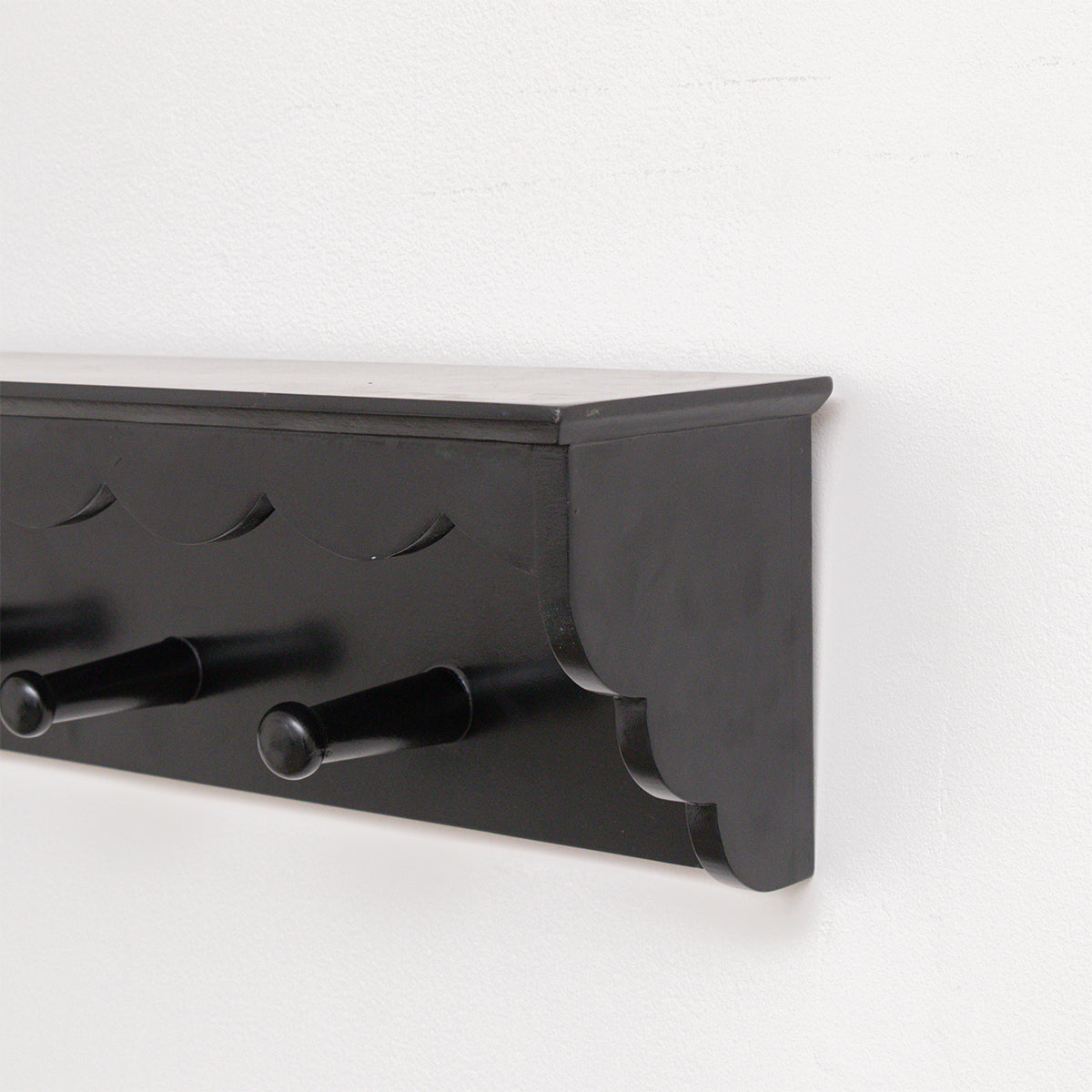 This Black Painted Scalloped Edge Coat Peg Rail Hooks with Shelf 80cm is a lovely storage choice, prefect for lovers of farmhouse design and dark decor. Made of Mango wood, this shelf has a classic, modern design and comes with 5 storage hooks. It can be wall mounted via hooks on the back.