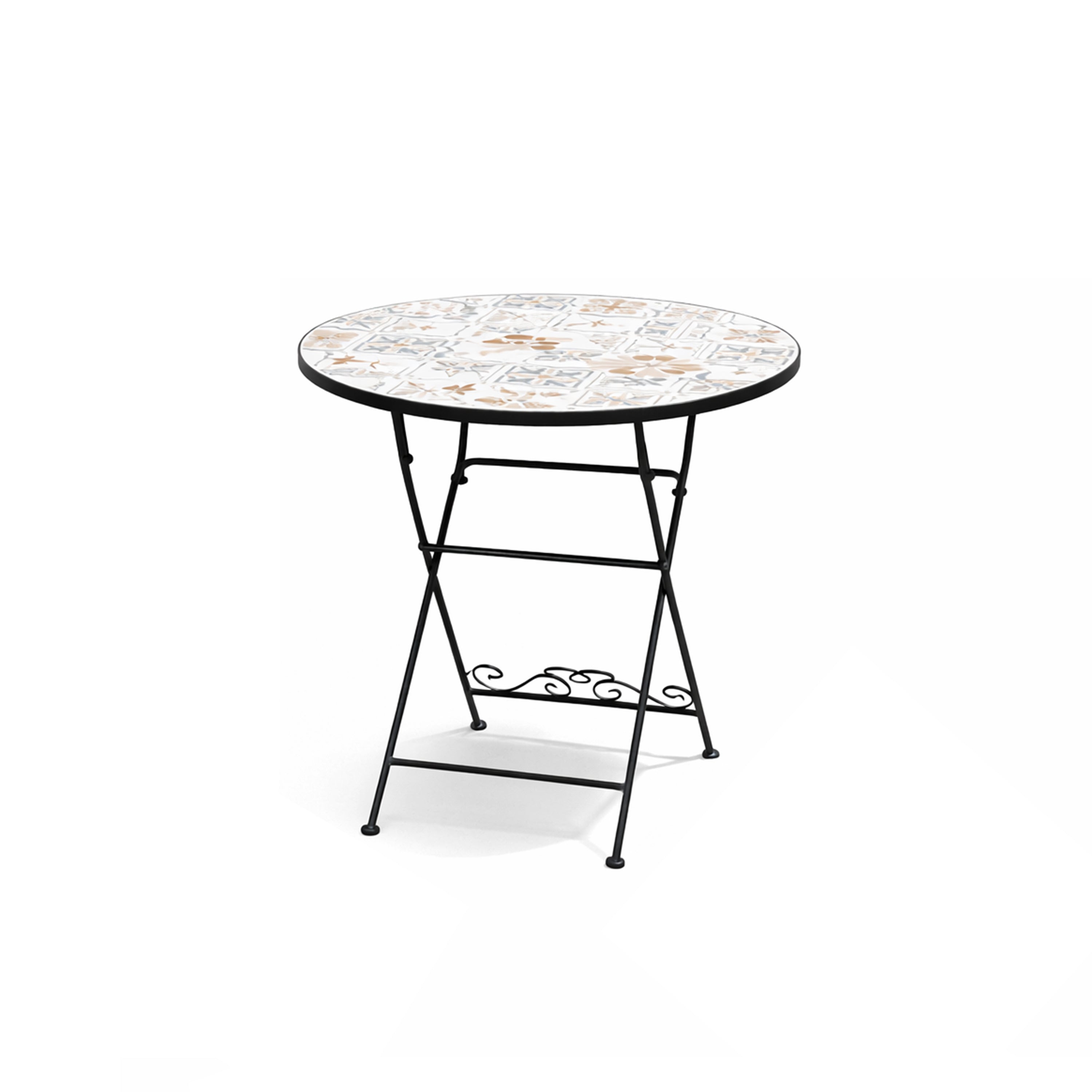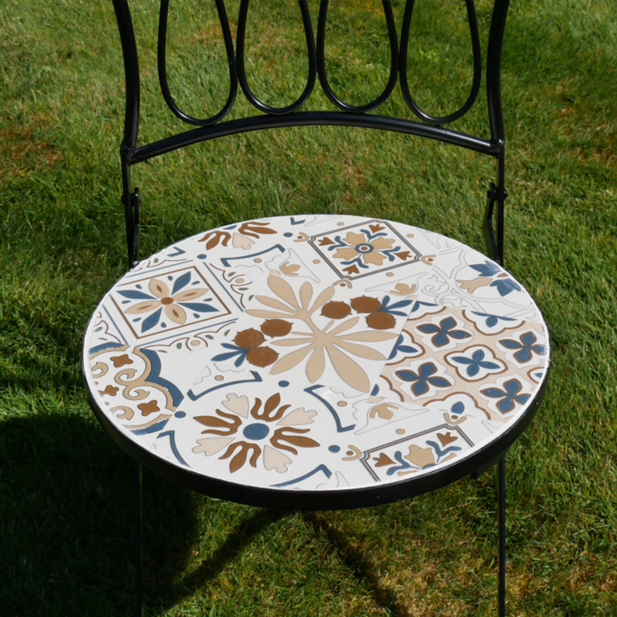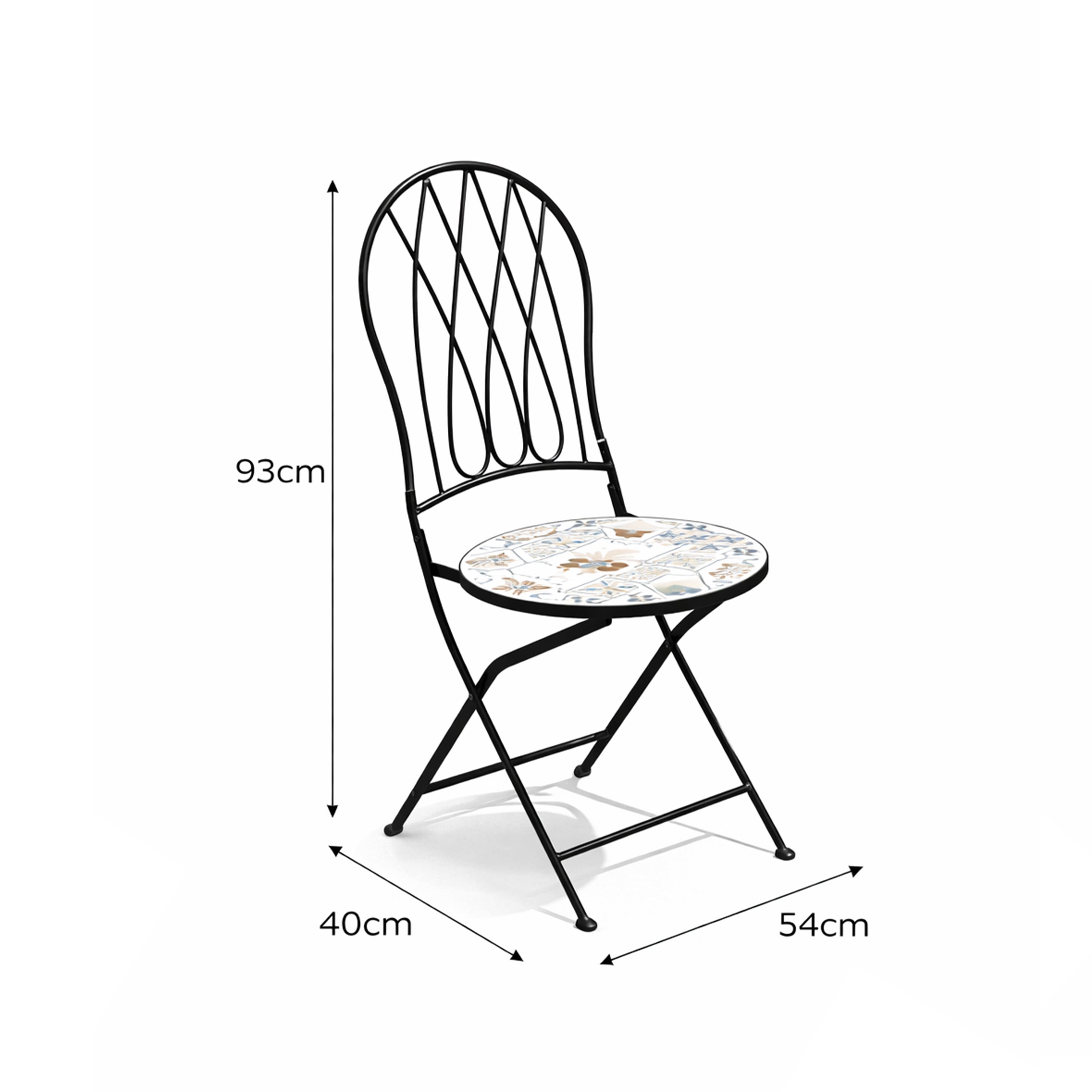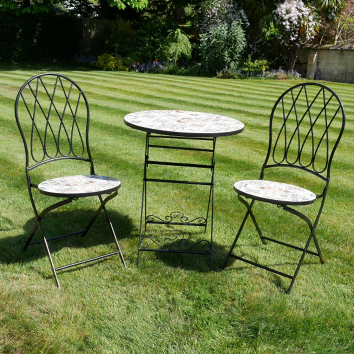 This Black & White Mosaic Garden Table & Chairs Set is a beautiful set consisting of a round table with two chairs. Made of metal, this set of table and chairs comes with a mosaic inspired design and a black painted finish. This set would look fabulous in a garden, on a patio or in a conservatory.