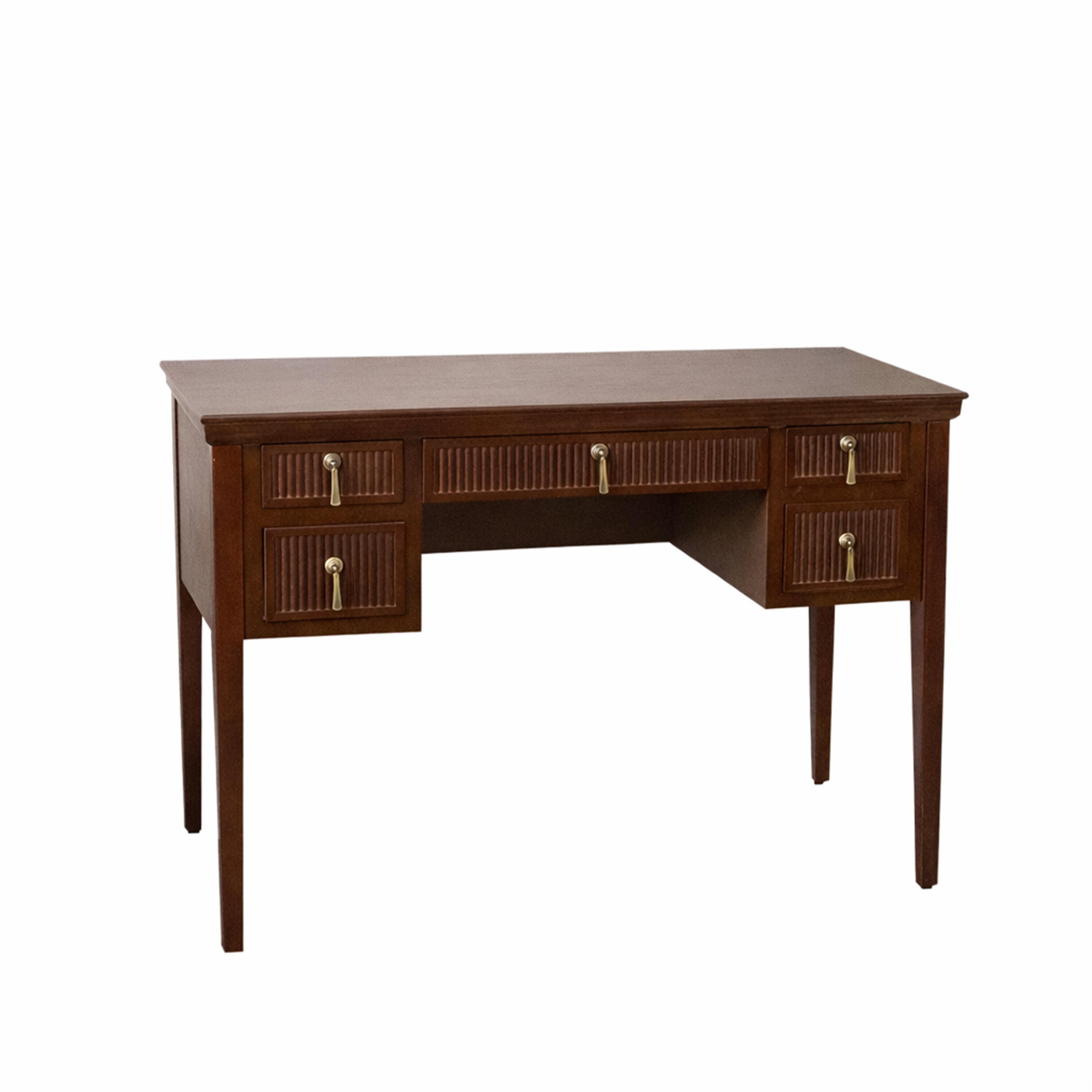This Dark Wood Reeded Dressing Table from the Georgian Range is a wonderful furniture piece, perfect for fans of wooden furniture and farmhouse style storage. This item is made from Wood and metal. This dressing table comes with 5 storage drawers and has a wooden reeded detailed frontage to the drawers and comes with antique Brass droplet handle.