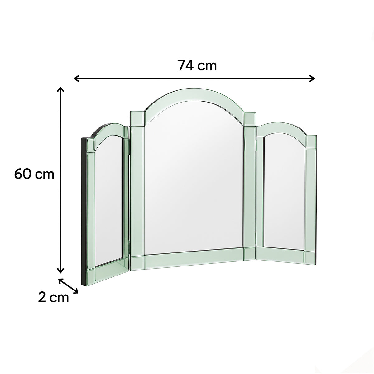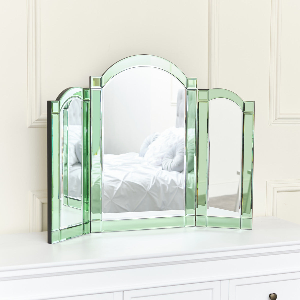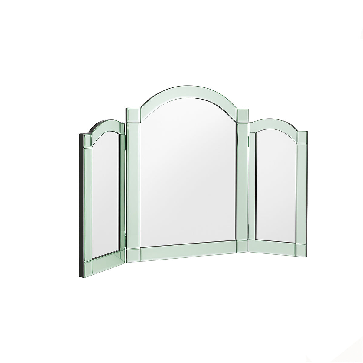 This Green Glass Art Deco Triple Mirror is a beautiful, vintage inspired table top mirror, perfect for any bedroom, dressing room or bathroom space. Made of Wood, Metal and glass, this mirror has a curved style and Triple mirror design