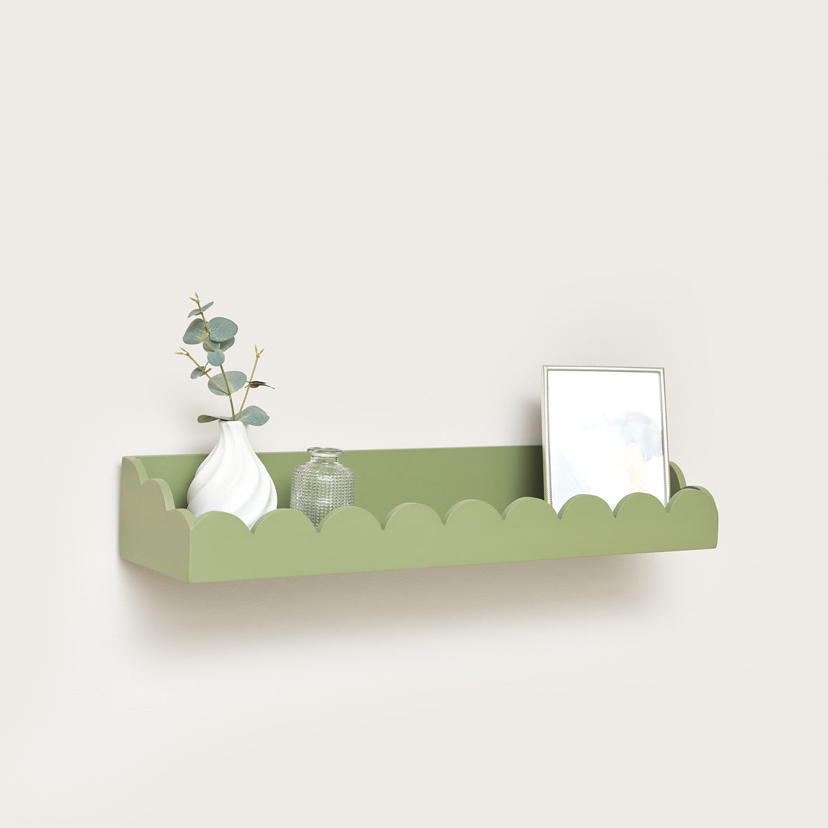 This unique sage green scalloped wall shelf is perfect for both storage and display options! Designed with a soft light green finish this shelf brings a subtle pop of colour while maintaining a timeless and versatile aesthetic to your walls. It’s delicate scalloped edged detailing adds a playful and unique sense making it perfect for a variety of interior spaces, from modern farmhouse to vintage and contemporary decor choices! Ideal for displaying framed photographs, candles, plants and decorative accessories! Whether paced in a living room, bedroom, kitchen and hallway this shelf offers a simple yet effective way to organise and showcase your favourite items! Browse our full Wall Cabinets and Shelves category for more options!