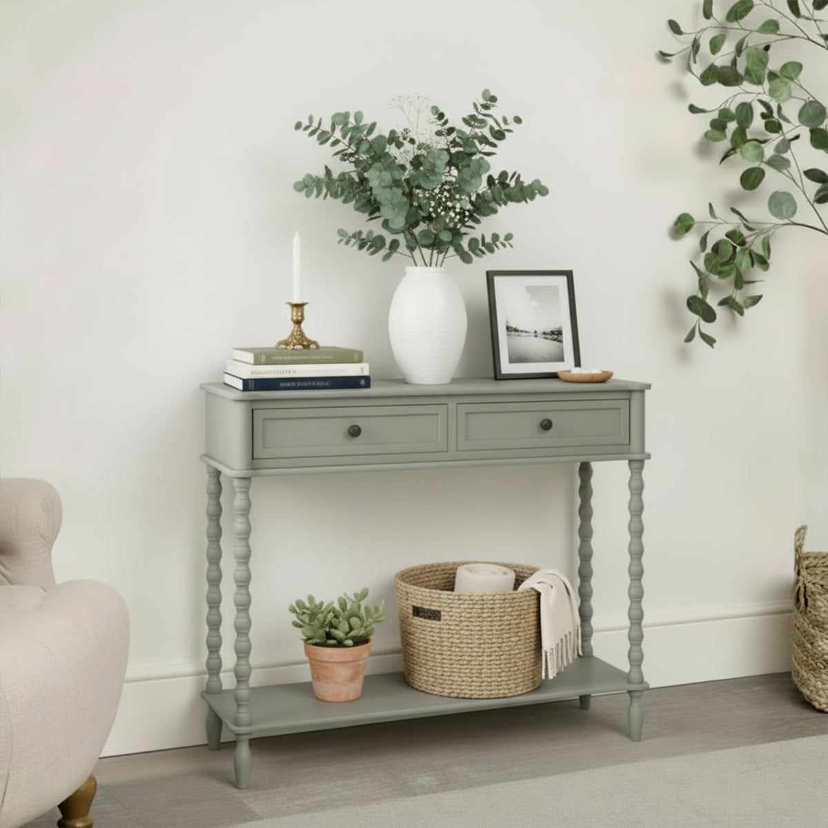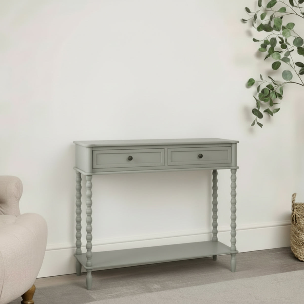This Grey Bobbled 2 Drawer Console Table/Sideboard is a well crafted, beautiful storage table, perfect for placing in a bedroom, hallway or dressing room space. Made of solid wood and metal, this console table has a two drawer design. This piece comes with bobbled detailing and a light grey finish.