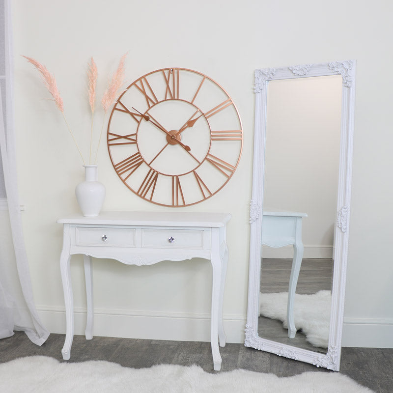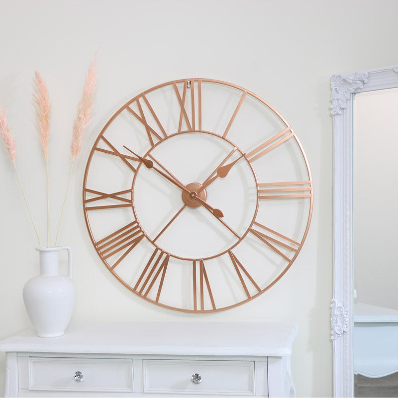 This Large Rose Gold Copper Metal Skeleton Clock is a bold yet elegant statement for your wall, designed with an open back frame and over sized roman numerals, this decorative timepiece effortlessly combines contemporary style with a touch of vintage charm. Finished in a warm rose gold tone, it brings a soft metallic touch to any space, whether hung in a hallway, lounge, kitchen, hallway or office. The classic roman numeral design adds a traditional flair, while the slimline metal frame keeps it feeling modern and airy, perfect for those who appreciate minimalist decor with a twist of glamour. This mirror is both practical and stylish! Ideal for adding character without cluttering your walls. Browse our full Home Accessories collection to view more!