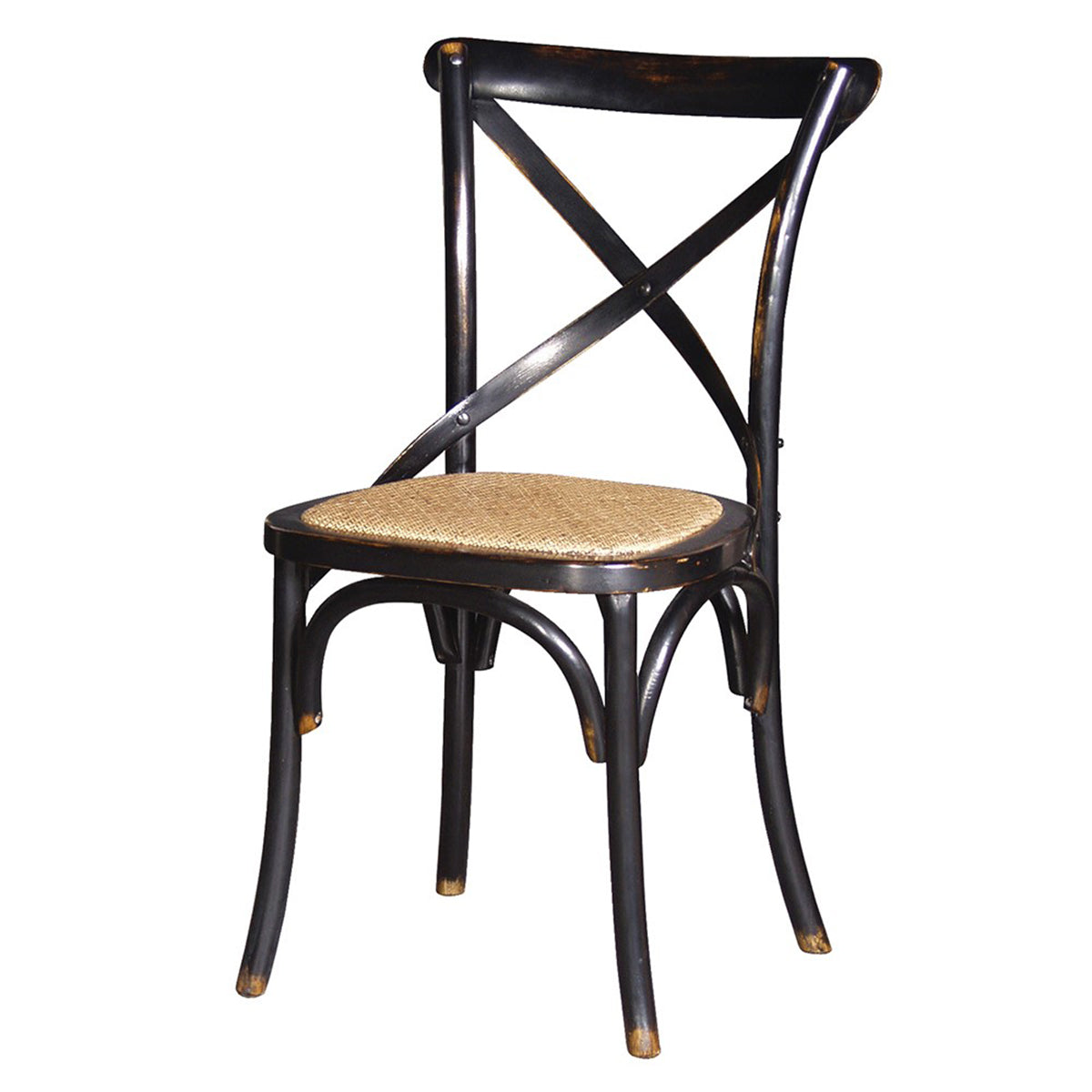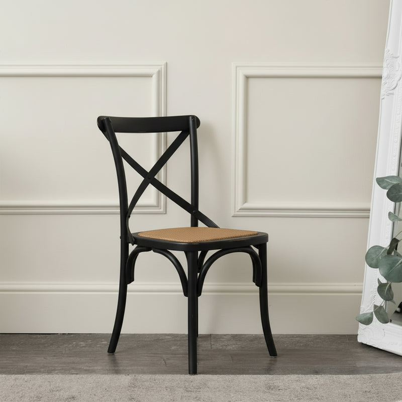 This Large Distressed Black Cross Back Wooden Dining Chair will add a mid century modern inspired feeling to any living room, dining room or office space. Made of wood, this chair has a black painted frame with a cross back detailed and distressed finish.