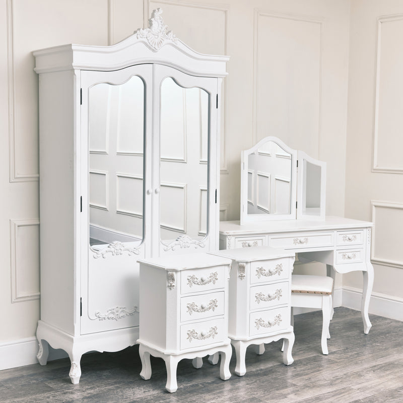 This Large Double Wardrobe, Dressing Table Set & Pair of 3 Drawer Bedside Tables from the Pays Blanc Range is a stunning French style bedroom furniture set, perfect for lovers of shabby chic style and vintage design. Made of wood, each piece comes with an antique white finish and ornate, French style festoon style detailing, complete with a brushed gold finish.