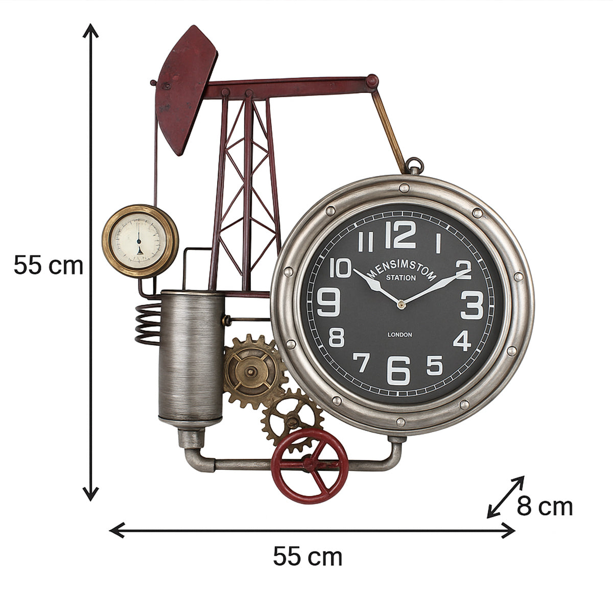 This Large Industrial Wall Clock 55cm x 55cm is a quirky piece of wall decor for fans of eclectic design and industrial inspired accessories. Made of metal, glass and plastic this clock has a black, silver, red and copper colour finish. It consists of a round clock with white numbers, brass metal cog detailing, red pipework and an imitation pressure dial.