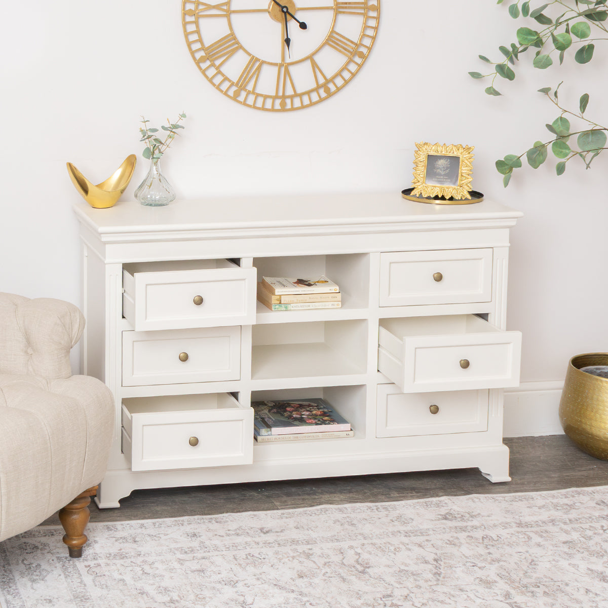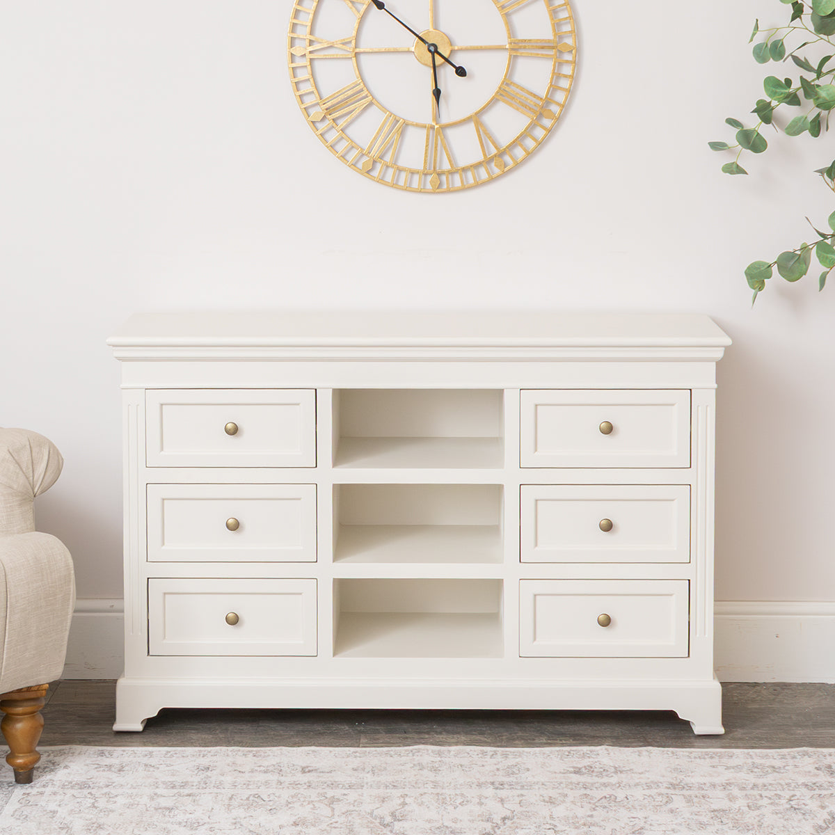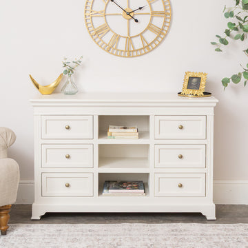 This Large Ivory Wooden Sideboard Cabinet from the Daventry Ivory Range is a beautiful, stylish storage choice for fans of vintage design and light bedroom furniture. Made of wood, this chest has a vintage inspired Georgian design and comes with simple grooved detailing and rounded brass style handles. It comes complete with an Ivory painted finish.