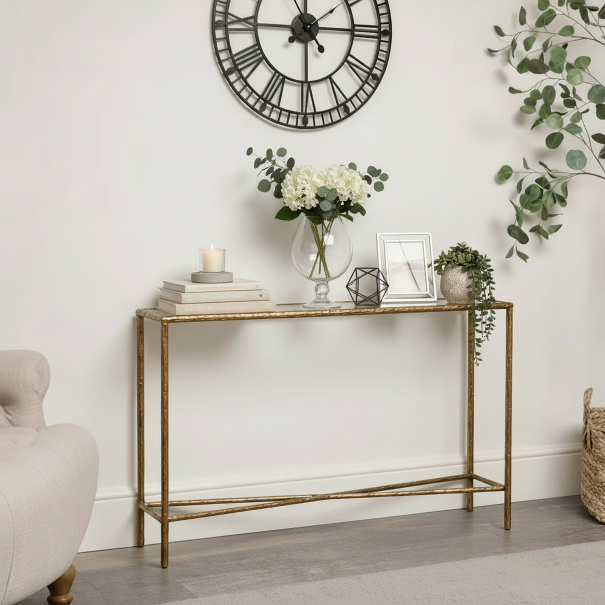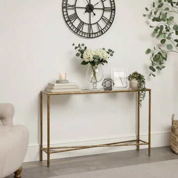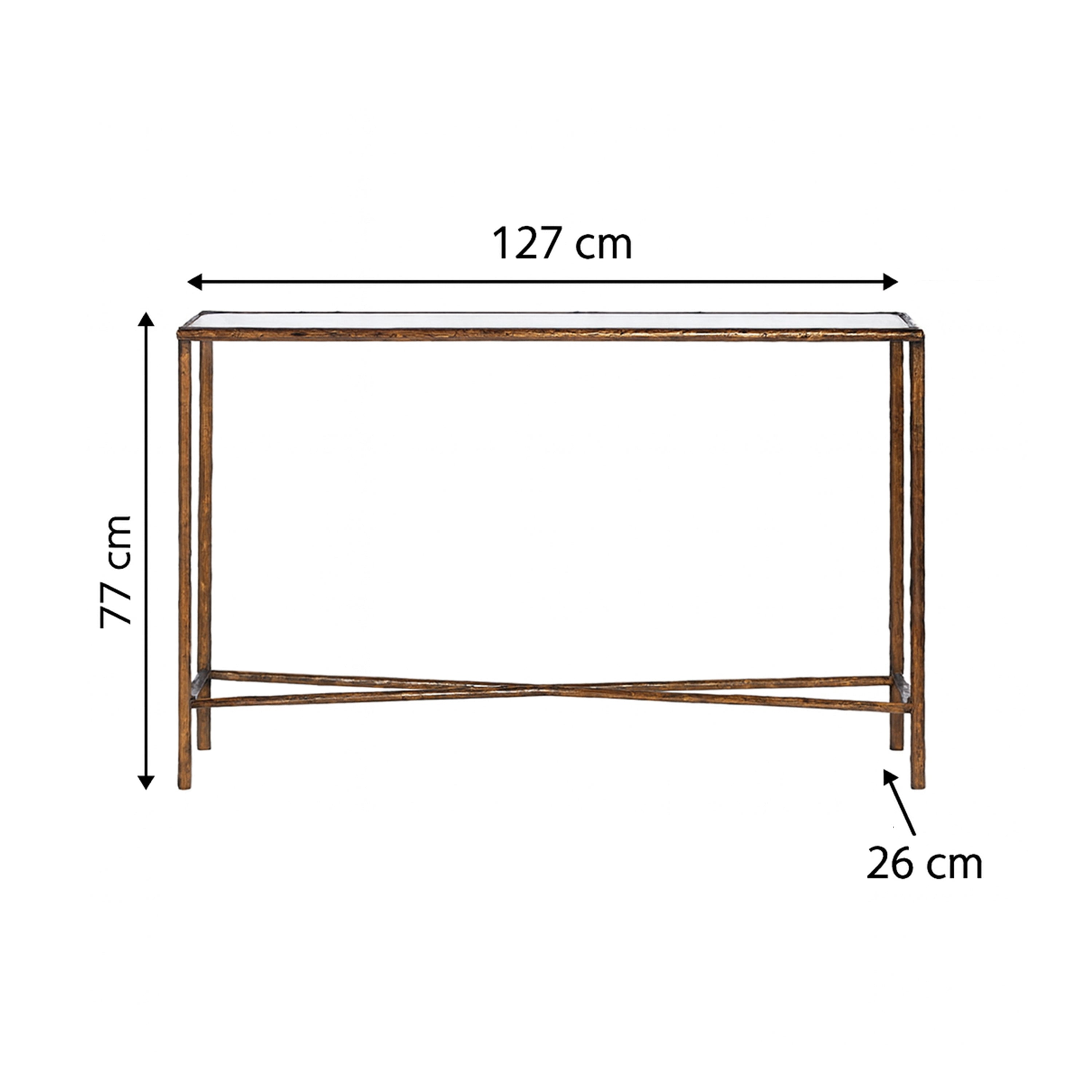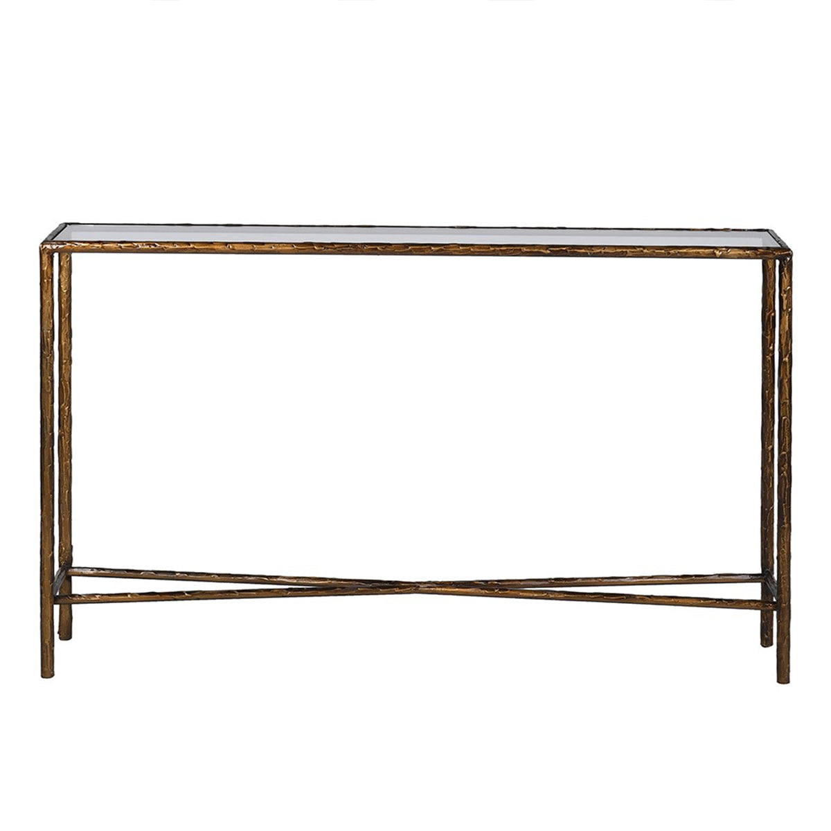 This Large Metal Antique Gold Console Table is a modern, glamorous console table that would be perfect for fans of mirrored furniture. Made of metal and glass, this console table has a metallic design and comes with a gold frame and a glass top surface.