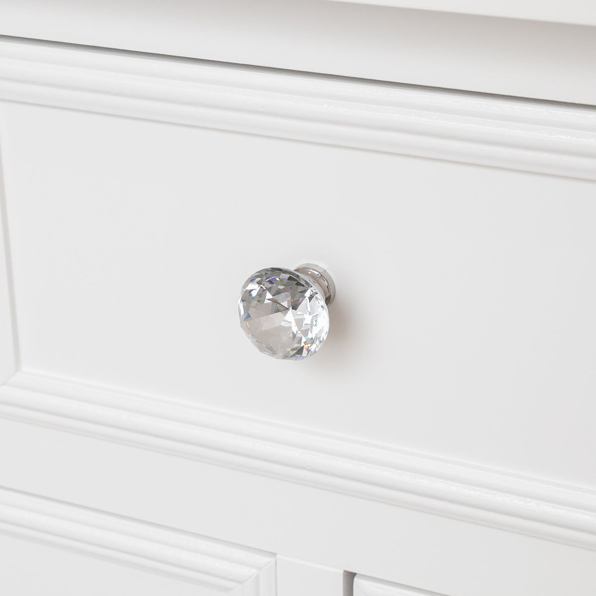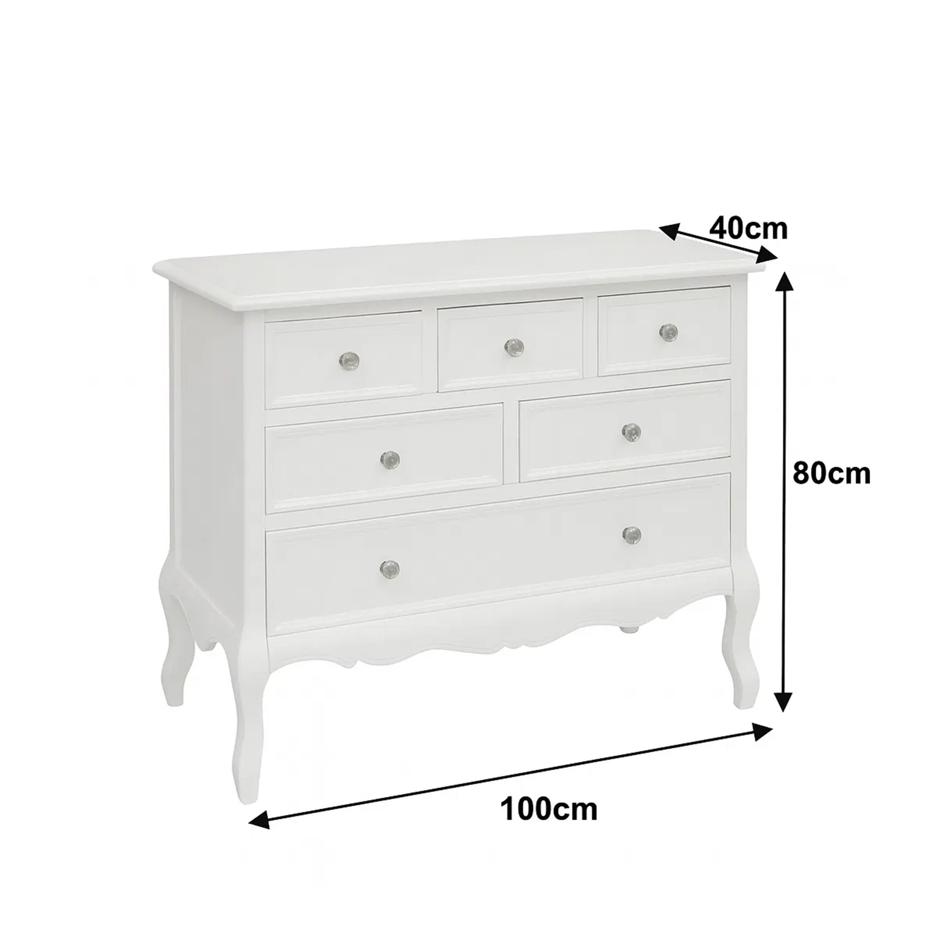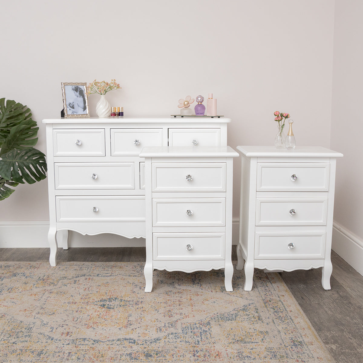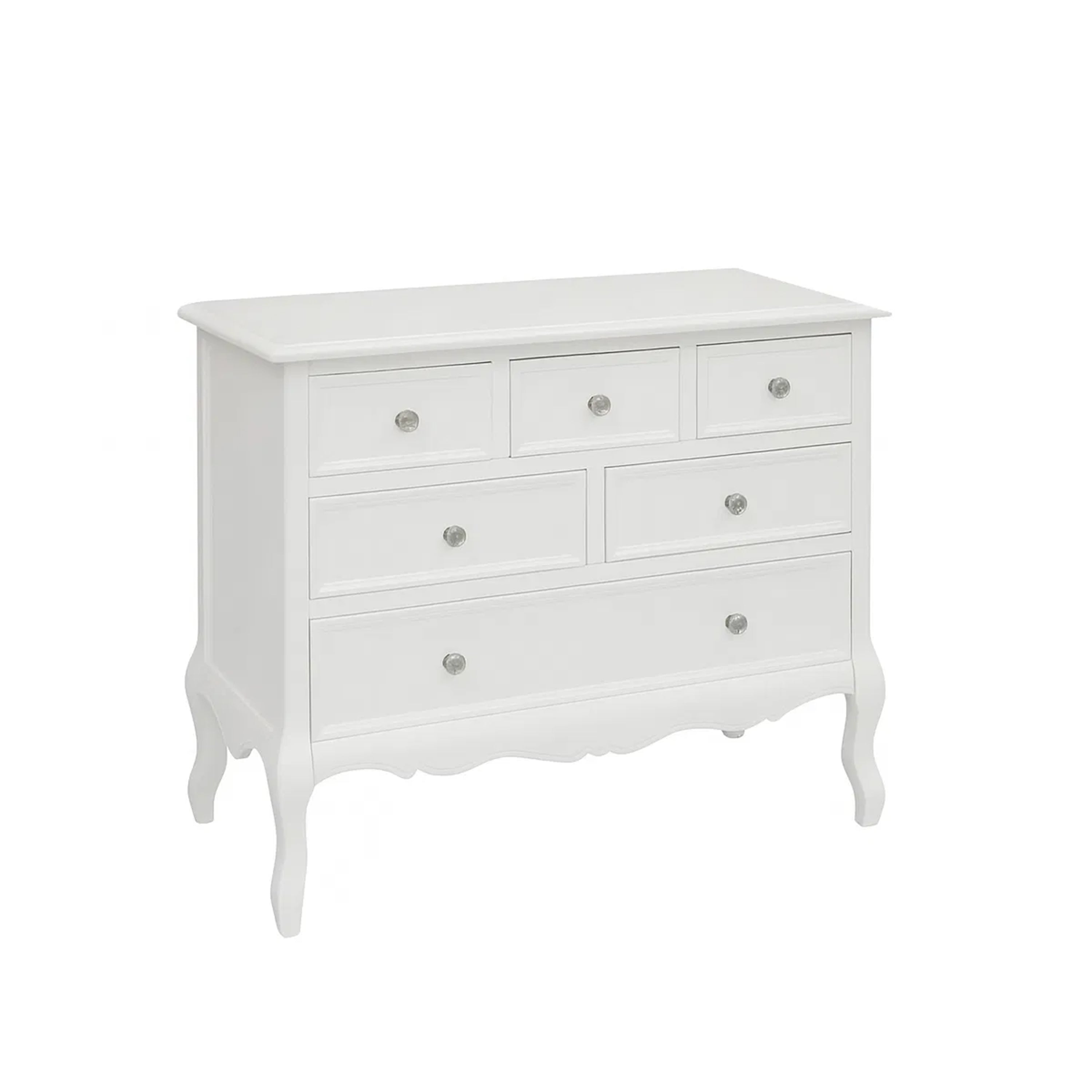 This Large White 6 Drawer Chest of Drawers & Pair of 3 Drawer Bedsides from the Victoria White Range is a beautiful bedroom furniture set, perfect for fans of vintage style and white furniture. Made of wood, this furniture set includes a 6 drawer chest of drawers and a pair of 3 drawer bedside table. Each peice comes with ornate grooved detailing, rounded rystal style handles and a white painted finish.