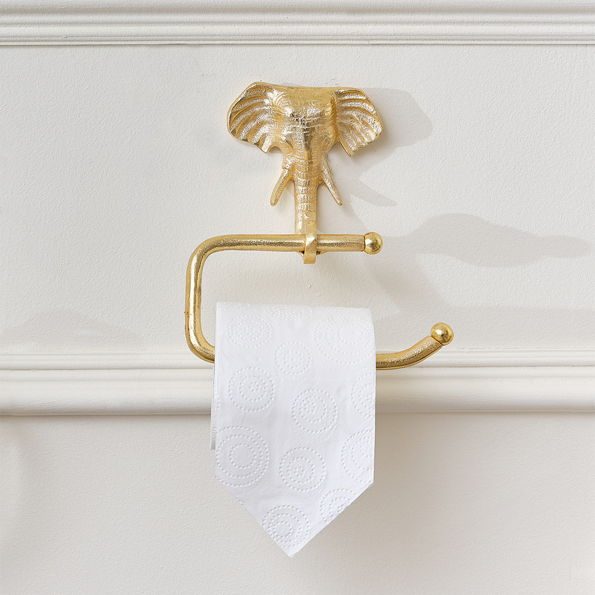 This Metallic Gold Elephant Toilet Roll Holder is a great way to liven up any home decor, an ideal choice for animal lovers. Made from iron in a metallic gold finish, easily wall mounted with screw holes for fitting.