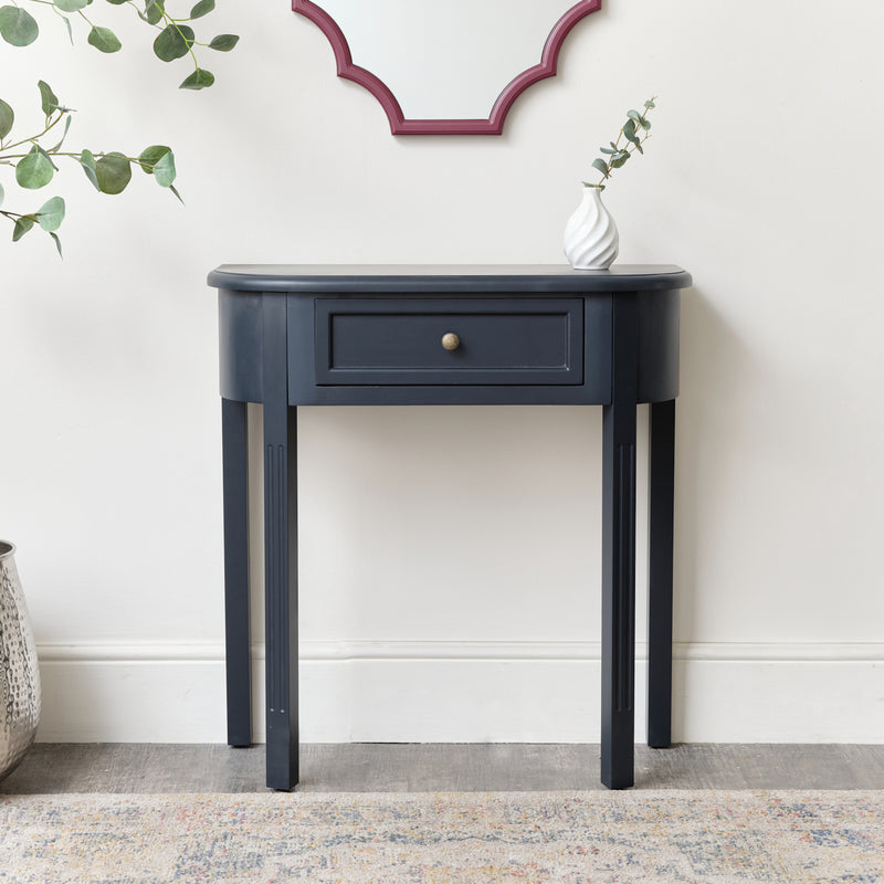 This Navy Black Half Moon Table from the Daventry Navy Black Range is the perfect furniture addition for a hallway or landing space. This half moon console table would also add character and storage space to a living room space as an occasional table, or as a side table. Complete with one drawer storage and a dusky, almost black, painted finish.