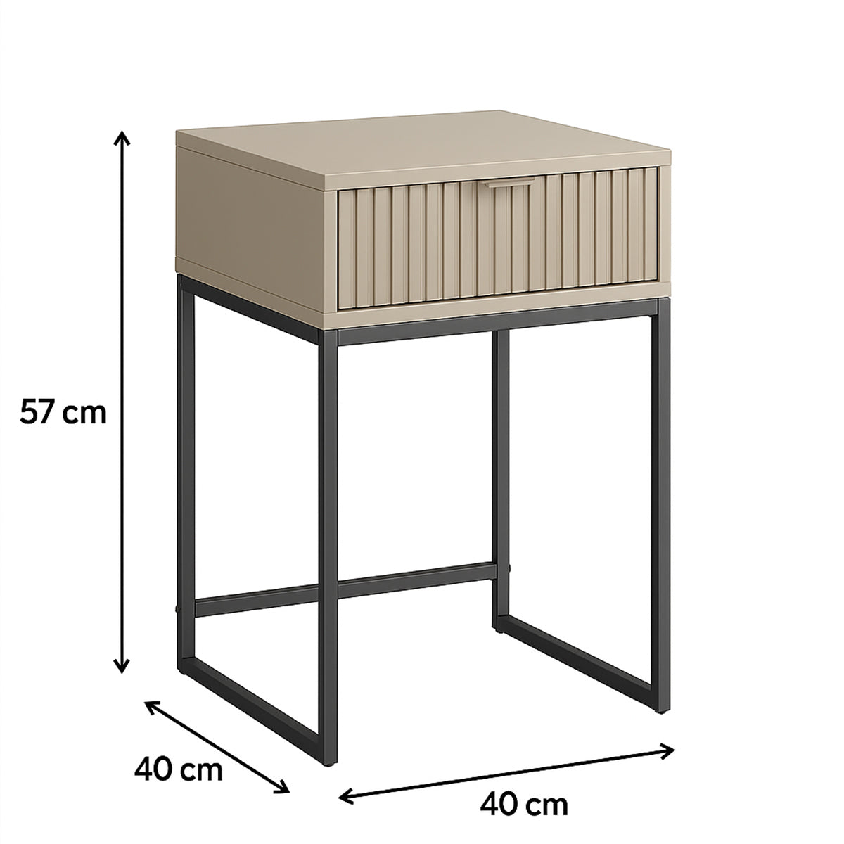 This One Drawer Bedside Table from the Hesley Taupe Stone Range is is a simple yet sleek selection of contemporary furniture. This Range is made of manufactured wood and metal. It comes with a soft Taupe Stone finish, a black metal frame and matching black handles. Items in this Range come with either fluted detailing to the drawer fronts or reeded glass panelling.