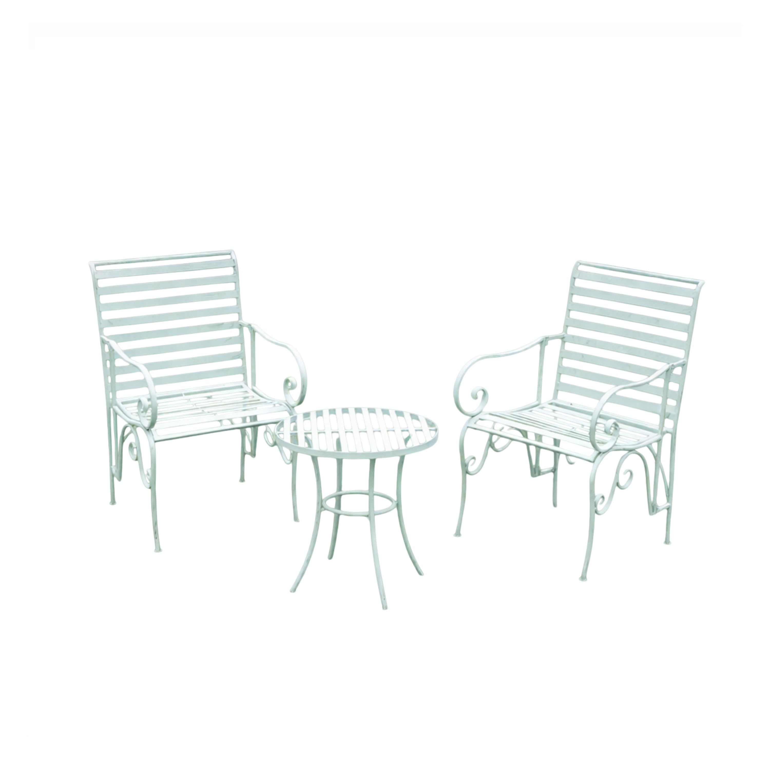 Ornate Metal Sage Green Round Garden Table & Set of 2 Ornate Garden Chairs