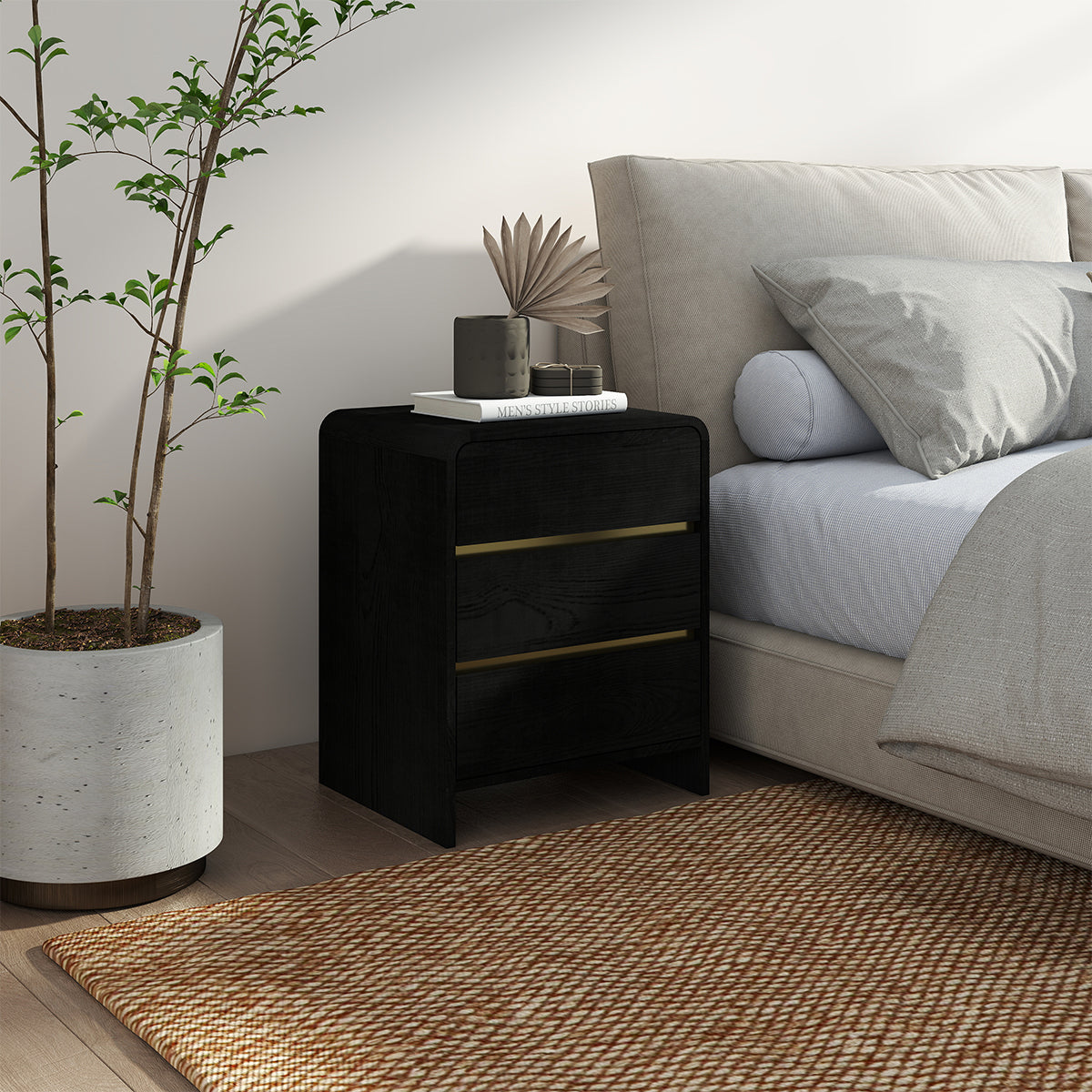 The classic design is enhanced by their curved edges and three spacious drawers, providing ample storage for nighttime essentials while maintaining a sleek and stylish appearance. Sturdy and durable, these bedside tables are perfect for both contemporary and modern interiors.