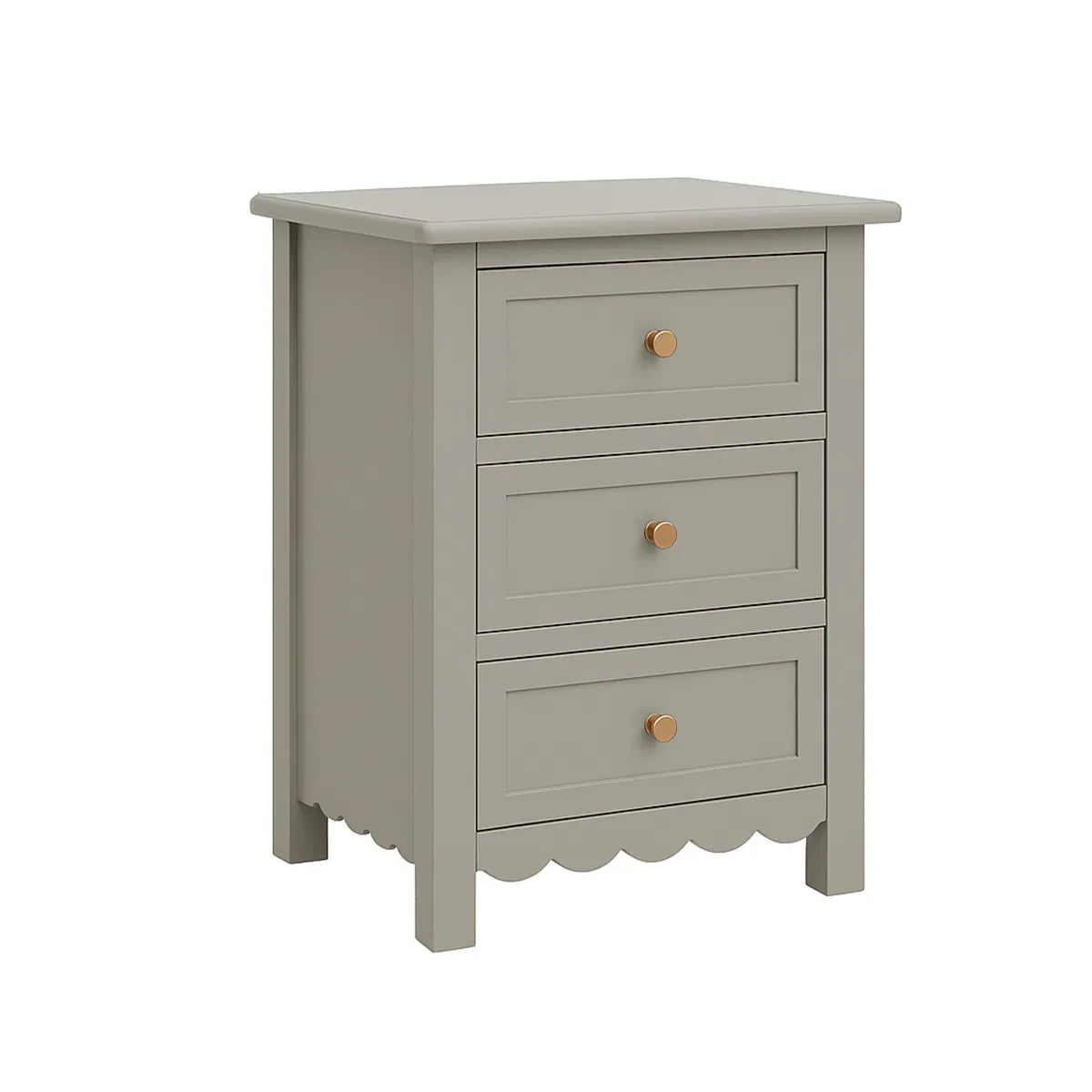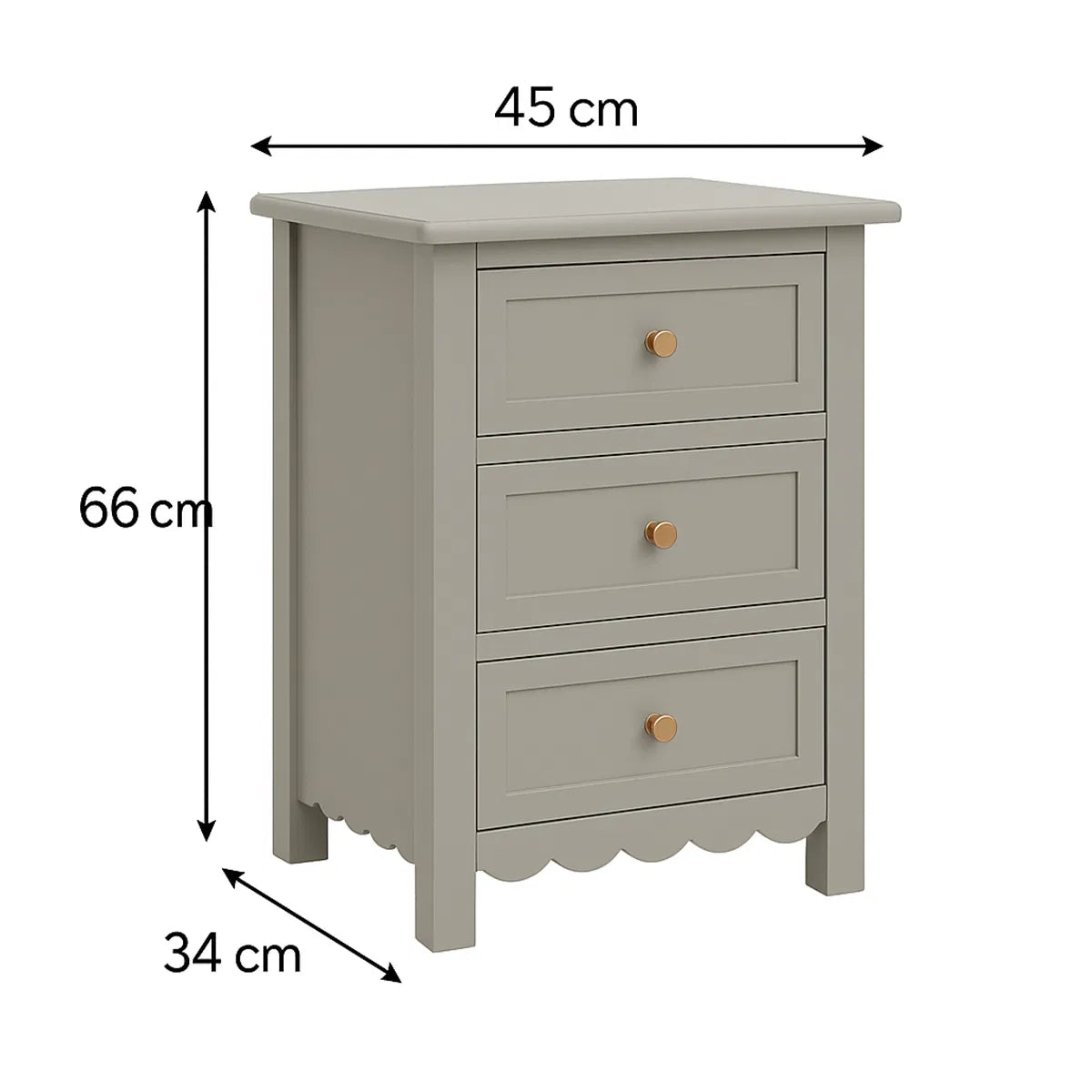 This Pair of Scalloped 3 Drawer Bedside Tables from the Staunton Taupe Range are a pretty, on trend furniture piece ideal for fans of taupe grey furniture, scalloped edges and whimsical design. These bedsides have a 3 drawer design and come with a taupe painted finish, gold metal handles and scalloped detailing on the bottom edge.