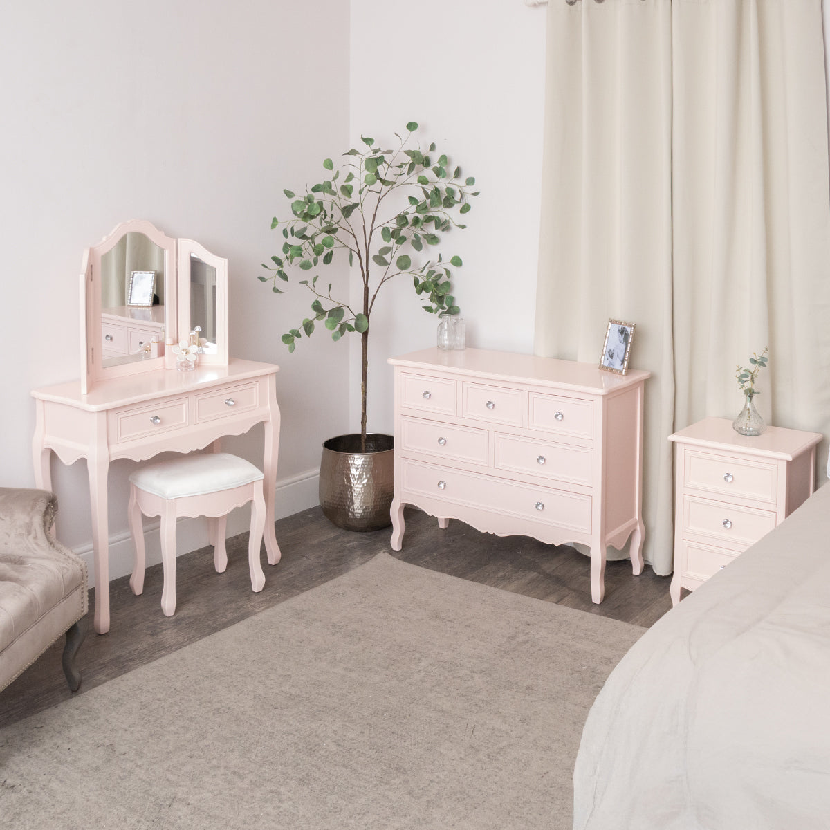 This Pink 3 Drawer Bedside Table from the Sophia Pink Range is a pretty, vintage inspired storage piece, perfect for placing in a bedroom. Made of wood, this side table has a 3 drawer design and comes with an elegant, French inspired design. It is completed with a peachy pink painted finish and rounded crystal style handles.