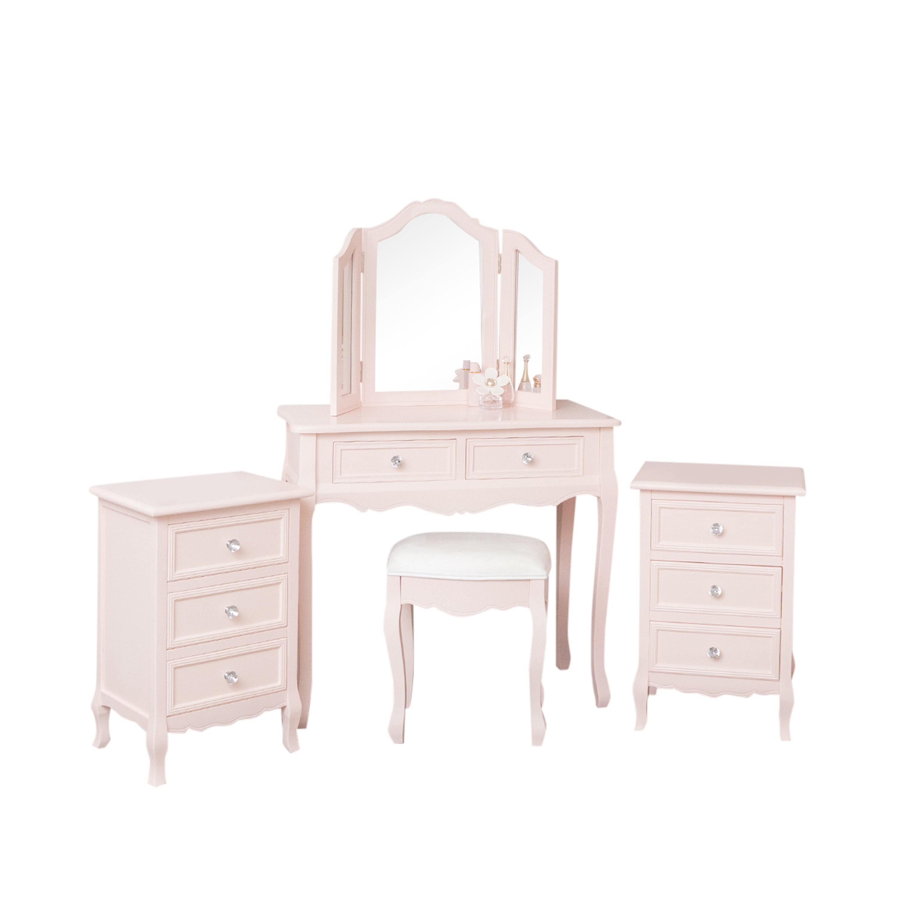 Pink Dressing Table, Mirror, Stool & Pair Bedside Tables - Sophia Pink Range
