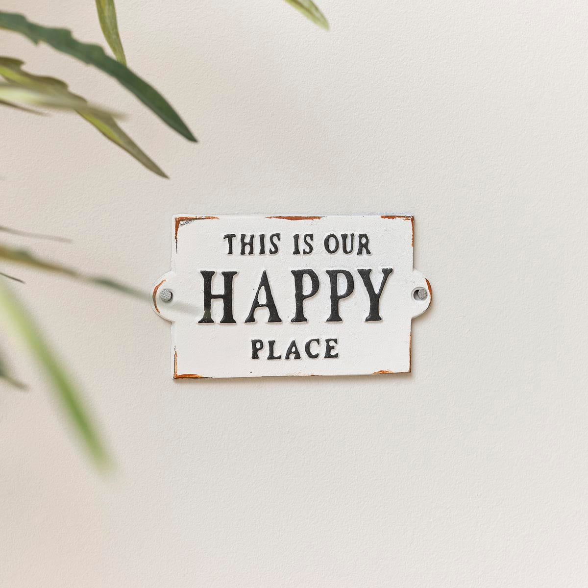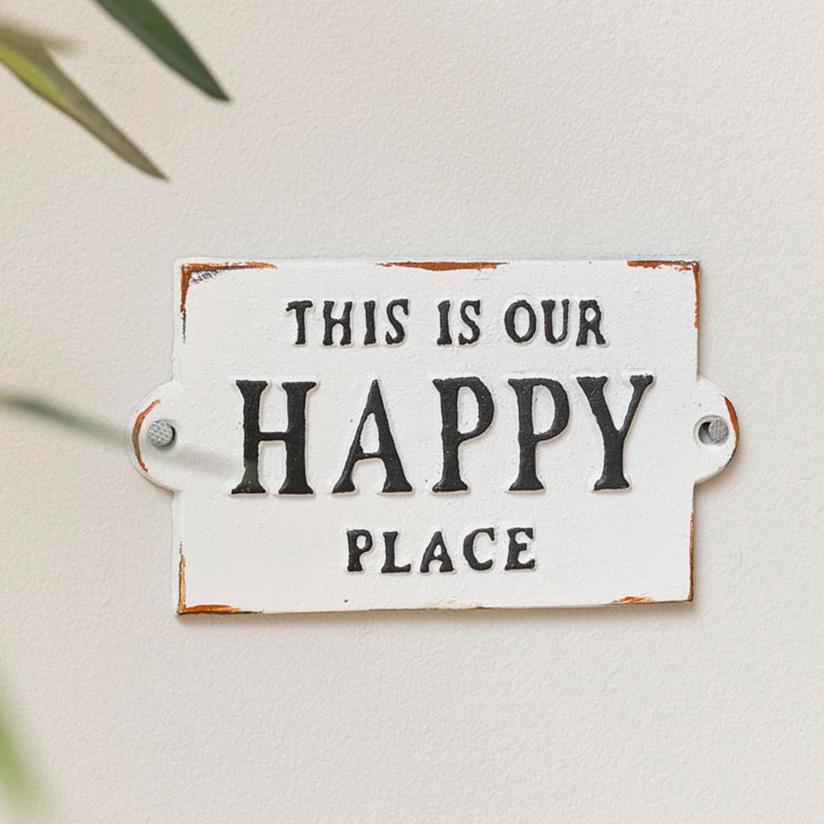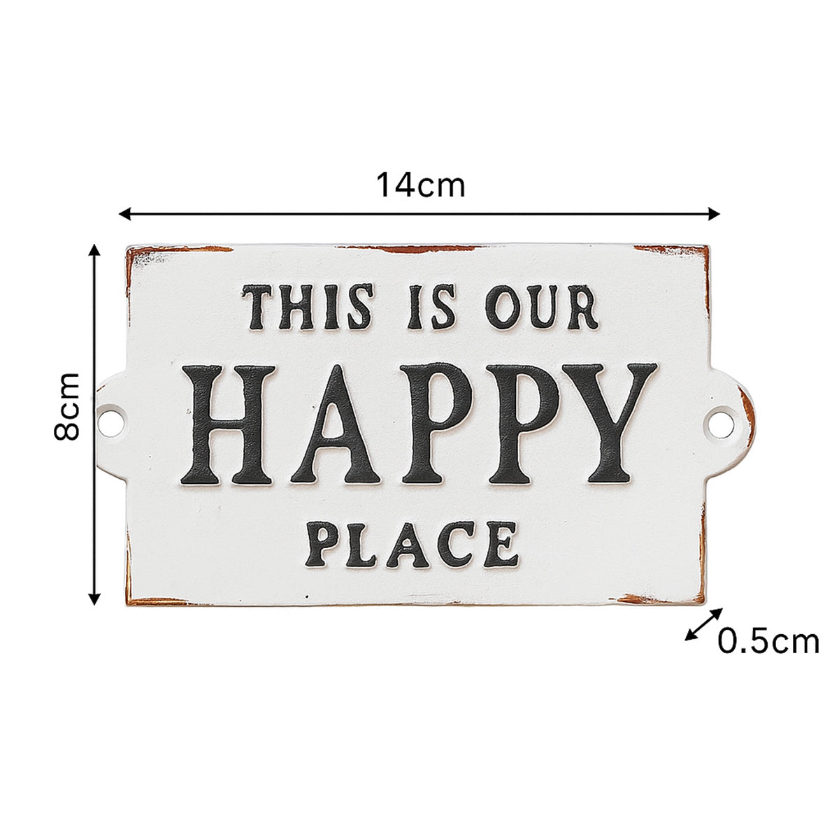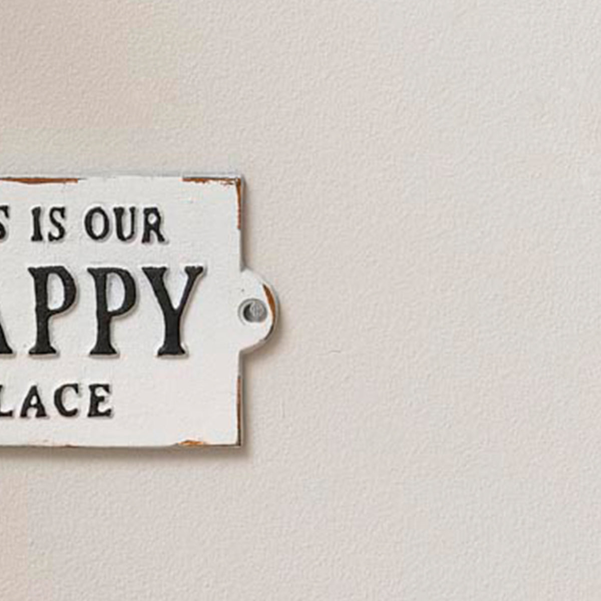 This Rustic White Metal 'Happy Place' Wall Sign is a simple, quirky piece of wall art, ideal for placing in a kitchen, hallway, bedroom or office space. Made of metal, this wall plaque comes with a rustic white painted finish and embossed black lettering spelling out 'This is our happy place'.