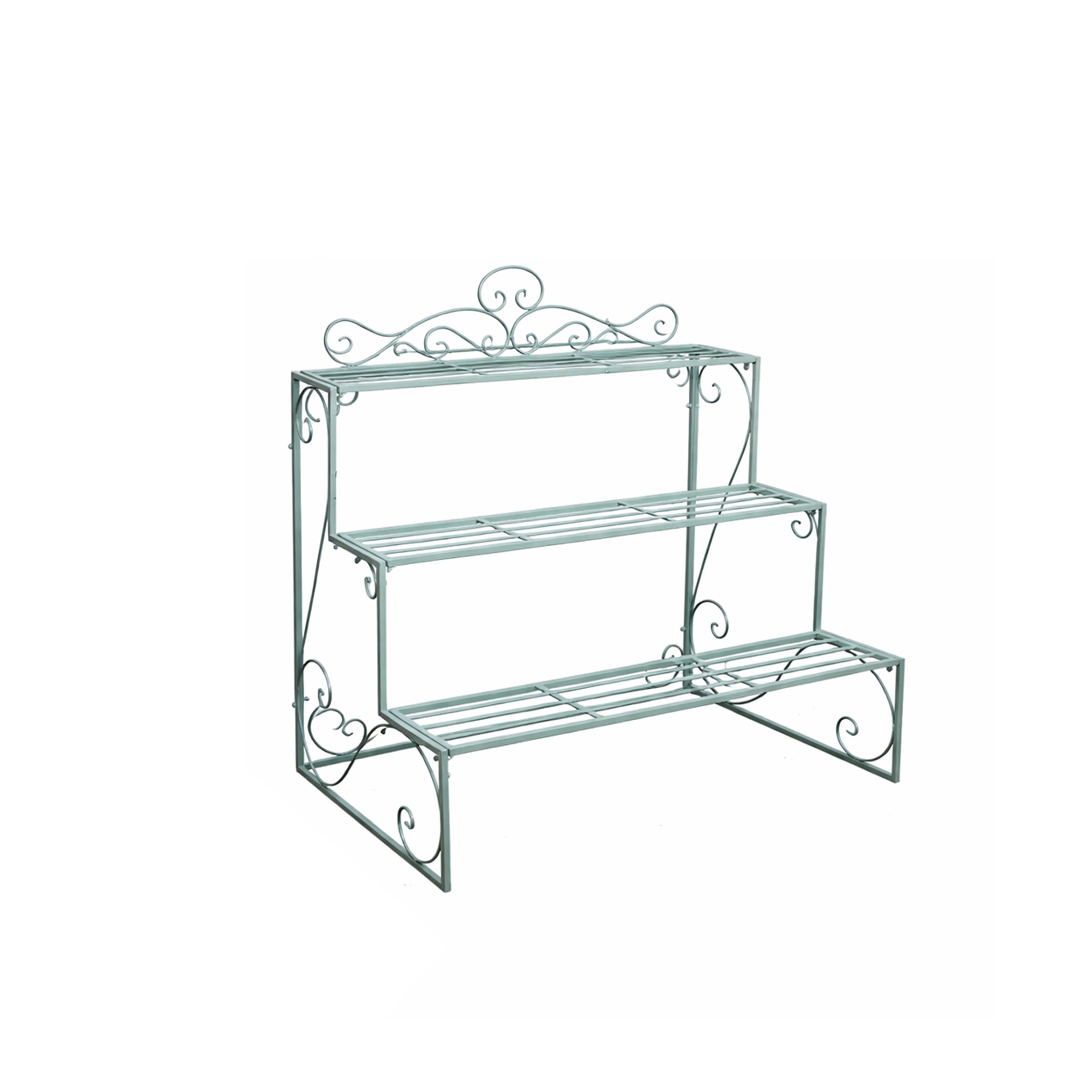 This Sage Green Metal Three Tier Plant Theatre Stand is a lovely, vintage inspired piece of outdoor display decor, ideal for fans of everything Sage Green. Made of metal, this plant theatre has a three tiered shelving design, it comes with curved, ornate detailing and a sage green painted finish.
