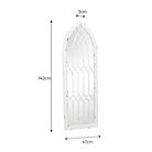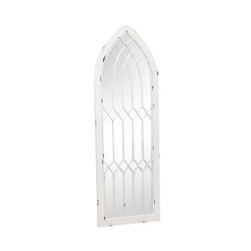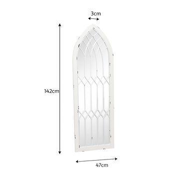 This Arched White Distressed Chapel Fretwork Garden Mirror 47cm x 142cm is an ideal wall mirror for any bedroom, hallway, bathroom or living room space. This mirror has a thin frame, with a natural distressed finish. A perfect mirror for those who prefer minimalist style home accessories. This mirror can be wall mounted vertically via hooks on the back.