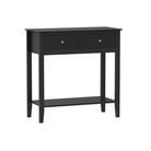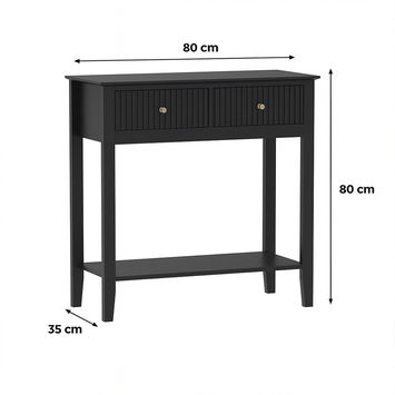 This Black 2 Drawer Console / Dressing Table from the Hales Black Range is a well crafted, beautiful storage table, perfect for placing in a bedroom, hallway or dressing room space. Made of wood and metal, this console table has a two drawer design. This piece comes with fluted detailing and a Black finish. This item comes with your choice of gold or black metal handles.