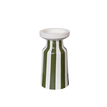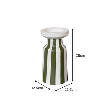 This Large Dark Green Striped Pillar Candle Holder 28 cm is a stylish, eye catching decor piece, perfect for lovers of striped decor and hand painted accessories. Made of metal, this candle stand has a tall, tapered design and comes with a circular candle base at the top. It is completed with a dark green striped, hand painted design.