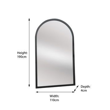This Extra Large Black Arched Frame Leaner Mirror 190cm x 110cm is a Black, free standing or wall mounted mirror, perfect for leaning against any wall or wall mounting for a more traditional look. Made off wood, glass and metal, this mirror has a smooth arched design and comes with a sleek Black frame.