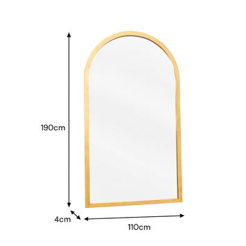 This Extra Large Gilded Gold Arched Frame Leaner Mirror 190cm x 110cm is a Gold, free standing or wall mounted mirror, perfect for leaning against any wall or wall mounting for a more traditional look. Made off wood, glass and metal, this mirror has a smooth metallic, arched design and comes with a Gilded Gold frame.