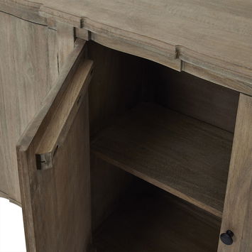 This Extra Large Wooden 4 Door Sideboard 200cm is a classically designed, well crafted piece of storage furniture. Made in a Washed, bleached wood finish, it comes with grooved detailing, rounded black handles and Handcrafted hard wood. Crafted from wood and metal, this large sideboard has a 4 door design and comes with 2 internal storage shelves.