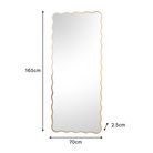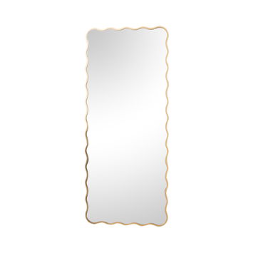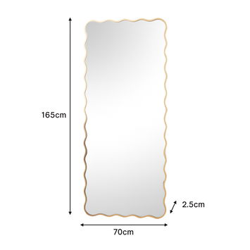 This Gold Full Length Wavy Mirror 70cm x 165cm is an eye catching, retro inspired large mirror that could be wall mounted or used as a leaner mirror. Made of wood, glass and metal, this mirror has a slim, wavy wooden frame and comes with a Gold painted finish. It can be wall hung both vertically and horizontally via wall hooks on the back of the mirror.