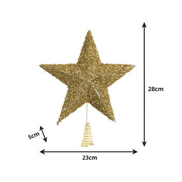 This Gold Sparkly Glitter Star Shaped Christmas Tree Topper is a glamorous gold Christmas decoration, perfect for adorning the top of you Christmas Tree. Made of resin and metal, this tree topper has a classic 5 point star shape and comes with a gold, sparkly finish.