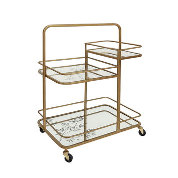 This Gold Vintage Printed Glass 3 Tier Drinks Trolley with Wheels is a beautiful, vintage inspired bar cart perfect for fans of botanical detailing and gold, mirrored furniture. This drinks trolley comes with a three tier design, complete with 4 bottle/glass holders. It has a gold finish and printed bird and leaf detailing on the mirrored glass.