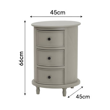 This Grey 3 Drawer Round Side Table is a modern, minimalist storage choice, perfect for fans of neutral interiors and contemporary style. Crafted from Wood and metal, this side table has a sleek, 3 drawer design and comes with ribbed detailing on the front of the drawers. It is completed with a Grey wooden finish and black metal handles.