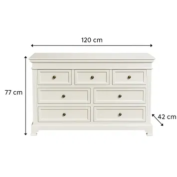 This Large 7 Drawer Chest of Drawers & Pair of Bedside Tables from the Daventry Ivory Range is an beautiful, stylish storage choice for fans of vintage design and neautral bedroom furniture. Made of wood, this set has a vintage inspired Georgian design and comes with simple grooved detailing and rounded brass style handles. They come complete with an Ivory, painted finish.