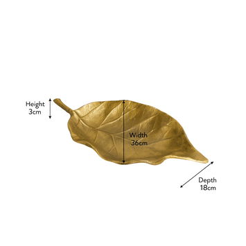 This Large Antique Gold Bay Leaf Shaped Trinket Tray is a pretty, eye catching decor choice, perfect for storing smaller items like sweets, jewellery or hair accessories. Made of metal, this tray has a traditional bay leaf shaped design and comes with an antique gold finish.