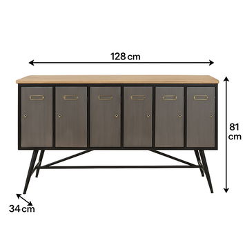 This Large Grey and Wooden Sideboard is a great addition to any home, perfect for the farmhouse inspired interior. Made from wood and metal in a dark grey and black finish with light wooden top and brushed metal handles.