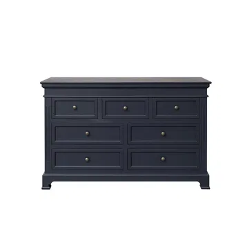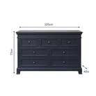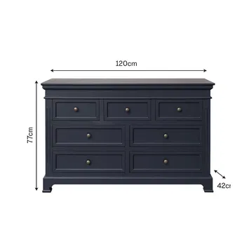 This Large 7 Drawer Chest of Drawers & Pair of Bedside Tables from the Daventry Navy Black Range is an beautiful, stylish storage choice for fans of vintage design and black bedroom furniture. Made of wood, this set has a vintage inspired Georgian design and comes with simple grooved detailing and rounded brass style handles. They come complete with a dusky, almost black, painted finish.