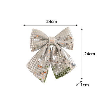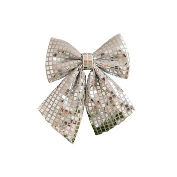 This Large Silver Mirrored Disco Detailed Decorative Christmas Bow - 24cm is a glamorous, eye catching festive decor choice, perfect for lovers of silver and disco inspired decor. Made of fabric and wire, this decoration has a classic bow design and comes with a silver mirrored disco finish. It can be attached via metal twistings at the back.
