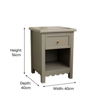 This One Drawer Scalloped Bedside Table from the Staunton Taupe Range is a stylish yet simple bedside table, ideal for placing next to a bed, sofa or in a hallway. This table is made of wood and comes with a warm, taupe grey painted finish, scalloped detailing and gold metal handles.