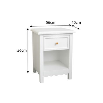 This One Drawer Scalloped Bedside Table from the Staunton White Range is a stylish yet simple bedside table, ideal for placing next to a bed, sofa or in a hallway. This table is made of wood and comes with a White painted finish, scalloped detailing and gold metal handles.