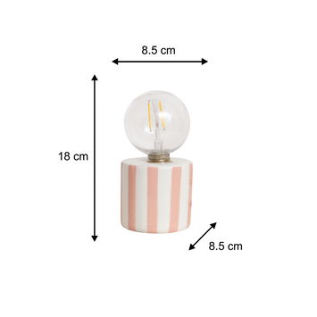 This Pink Cabana Stripe LED Desk Lamp 18cm is a beautiful, elegant lighting choice for fans of colourful accessories and glass homeware. Made of glass and dolomite, this lamp has a pink and white striped base with a clear glass bulb.