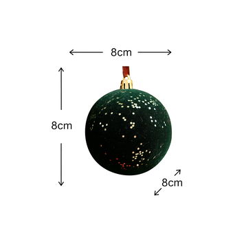 This Set of 2 Green Glitter Flocked Bauble Decorations - 8cm are a glamourous set of decorations, perfect for lovers of everything green and velvet. Made of plastic and velvet, these baubles come with a dark green colour and a velvet flocked finish with round glitter detailing.